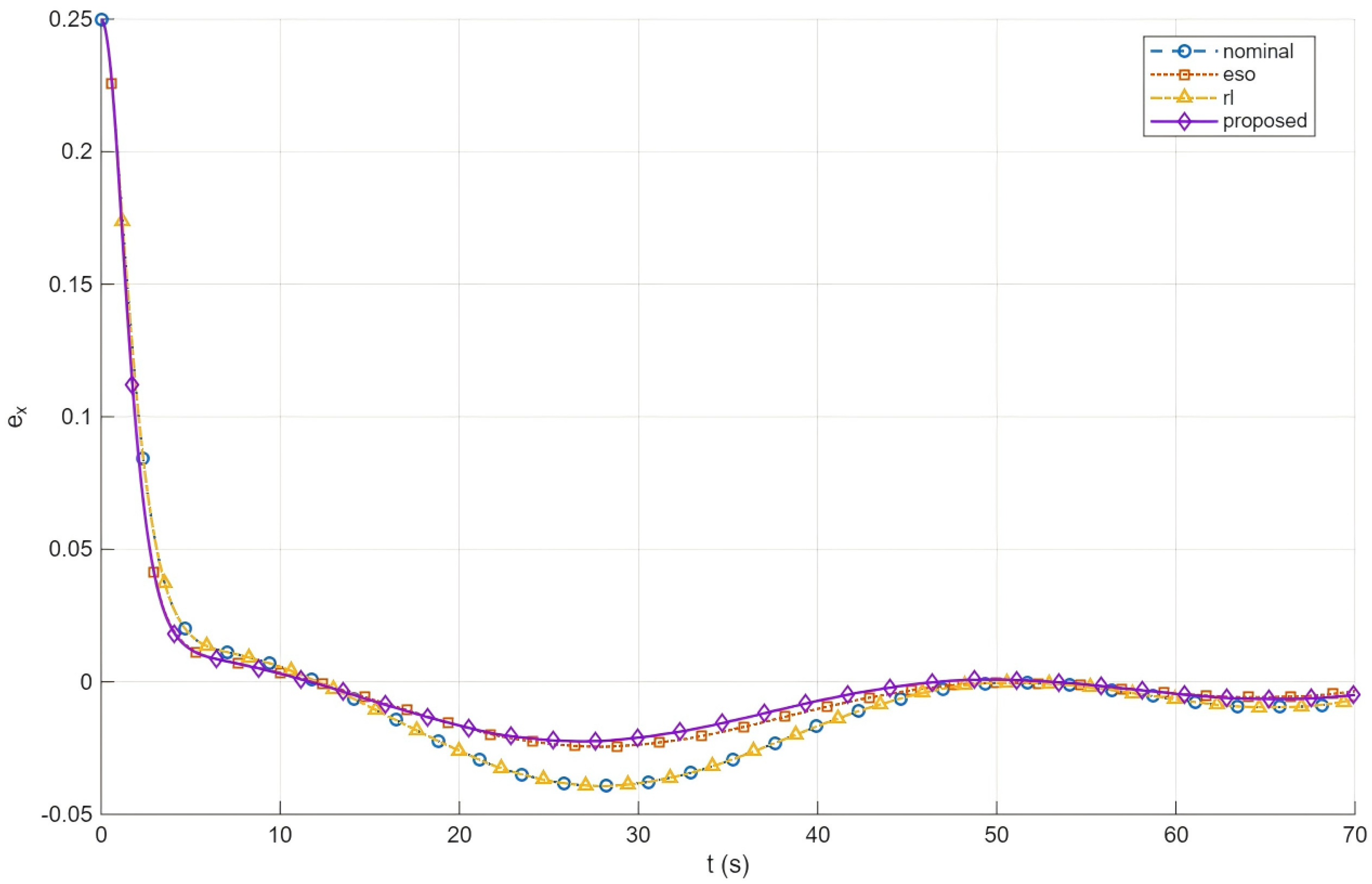 The results indicate that the ESO module provides the dominant disturbance rejection capability in this scenario, and the actor–critic coupling mainly serves as a Lyapunov-guided consistency regularisation and online refinement component rather than the primary source of robustness. Therefore, the RL-only baseline can be close to the nominal controller and the additional benefit of ESO plus RL over ESO-only may be modest under the reported disturbance realisation.