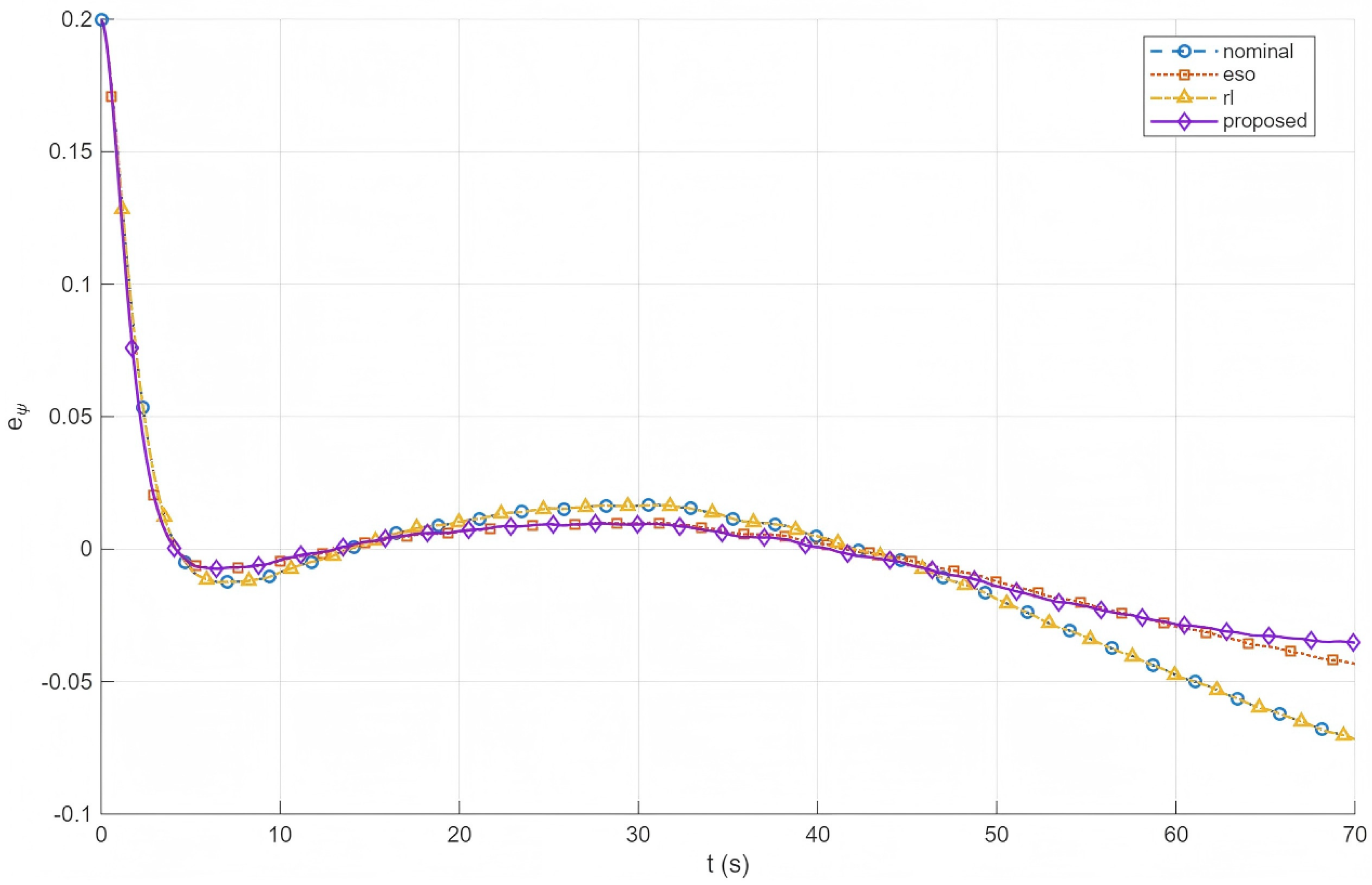 Table 3 indicate that the dominant robustness improvement in this representative case is provided by the ESO-based disturbance estimation, while the actor–critic component mainly serves as a Lyapunov-guided consistency regularisation and secondary refinement mechanism within the proposed control-oriented framework. Therefore, the numerical margin between ESO only and ESO plus actor–critic may be modest under the reported disturbance realisation, and we avoid interpreting it as a statistically significant gain without repeated-run dispersion measures.