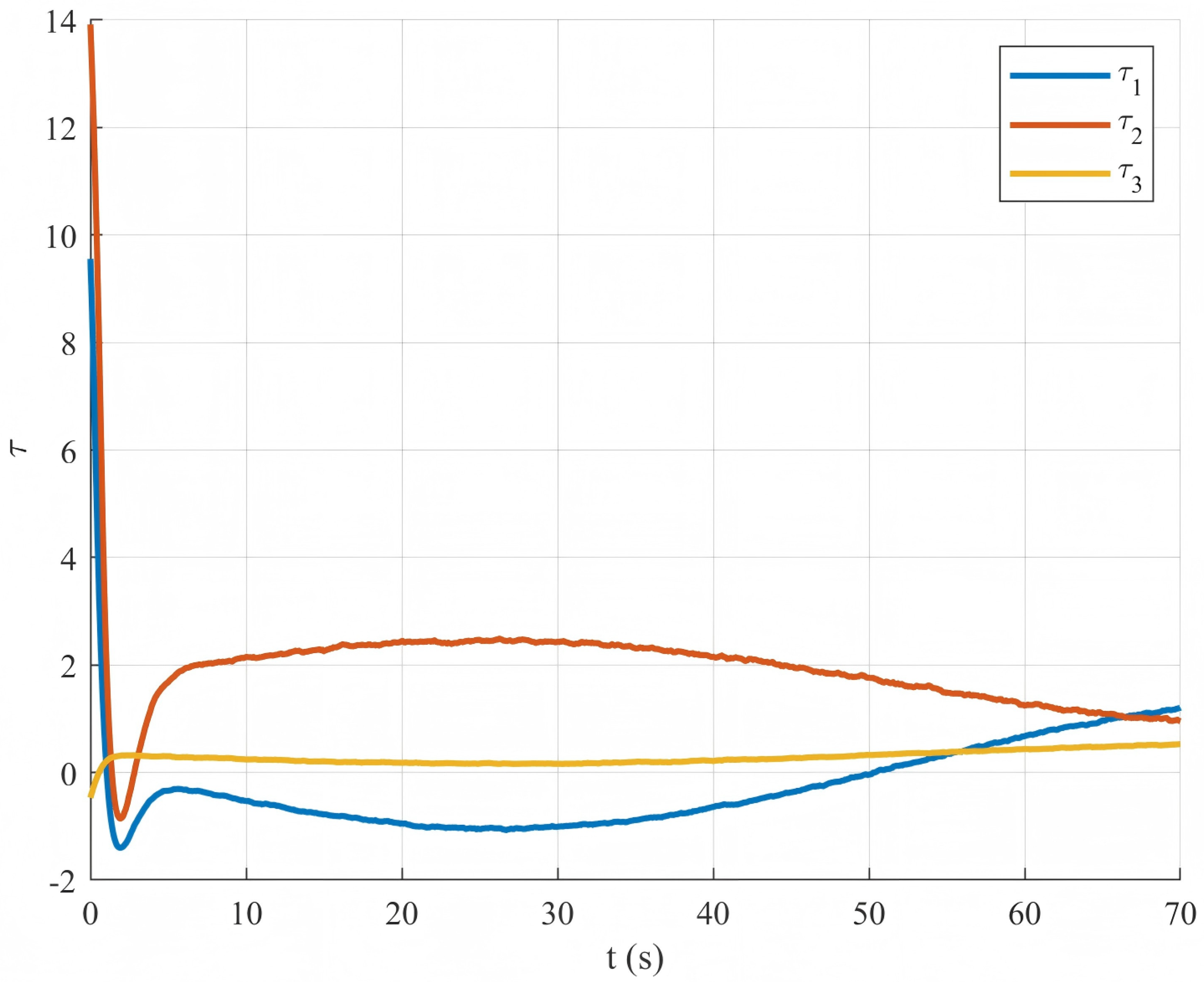 for the proposed controller. The input signals exhibit a larger transient effort to recover from the initial offset, followed by a bounded and smooth steady regime. Importantly, the improved tracking accuracy of the proposed method is not achieved by persistent saturation or excessively aggressive actuation; instead, it results from the complementary compensation structure that combines disturbance estimation and learning-based residual. The control inputs generated by the proposed controller. The signals show a larger but short-lived transient effort to compensate the initial offset, followed by bounded and relatively smooth steady behavior. This indicates that the improved tracking observed in