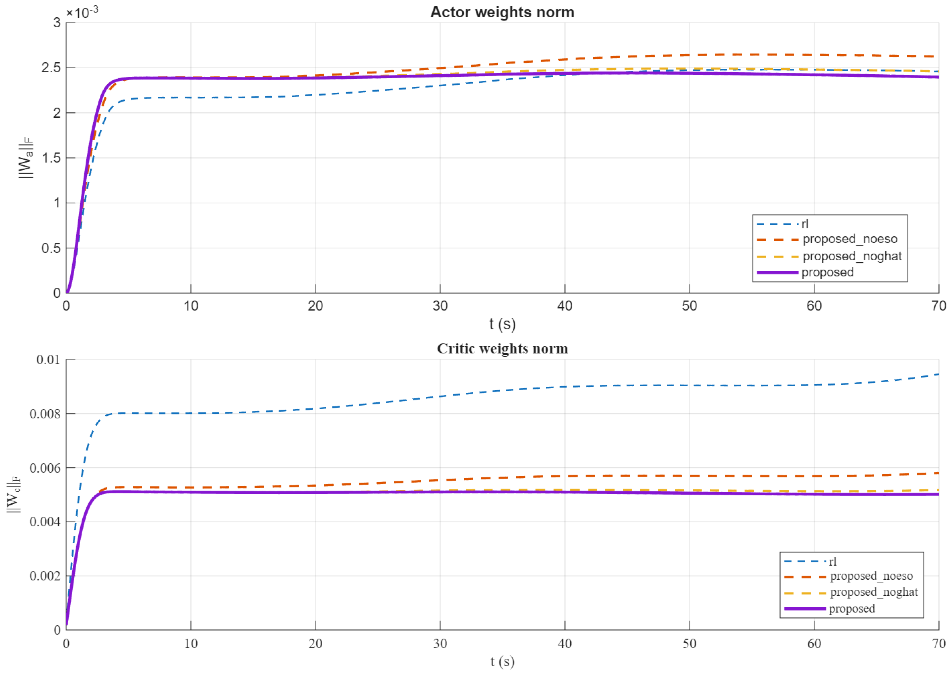 Figure 6 reports the evolution of actor and critic weight norm. Compared with RL-only, the proposed architecture yields a markedly smaller and more stationary critic weight norm, indicating that ESO and input-effectiveness adaptation reduce the residual uncertainty seen by the RL layer, thus improving learning stability and accelerating convergence. This shows the evolution of the actor and critic weight norms. The trajectories indicate that the coupled update law provides a bounded and stable parameter adaptation process, which is consistent with the Lyapunov-guided consistency regularisation interpretation of Equations (