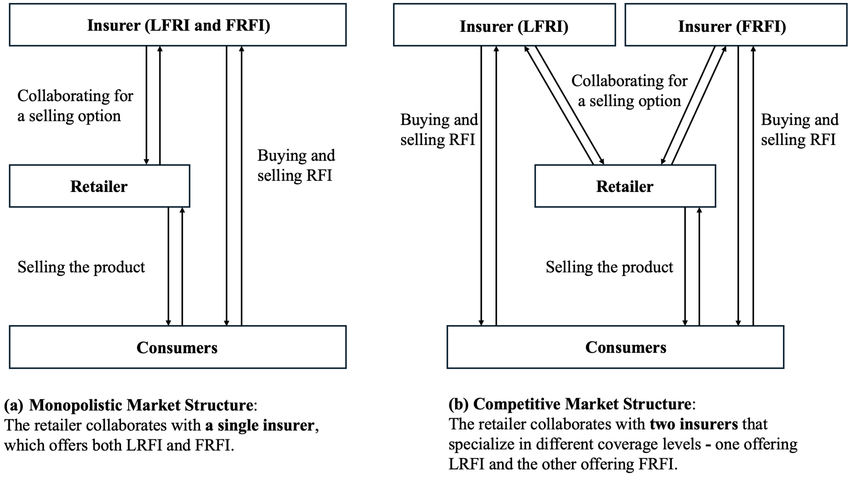 Figure 1. First, the e-tailer determines the RFI collaboration structure—either an exclusive insurer offering both LRFI and FRFI or two competing insurers each offering one insurance option. Second, insurers set the premiums for LRFI and FRFI, denoted by