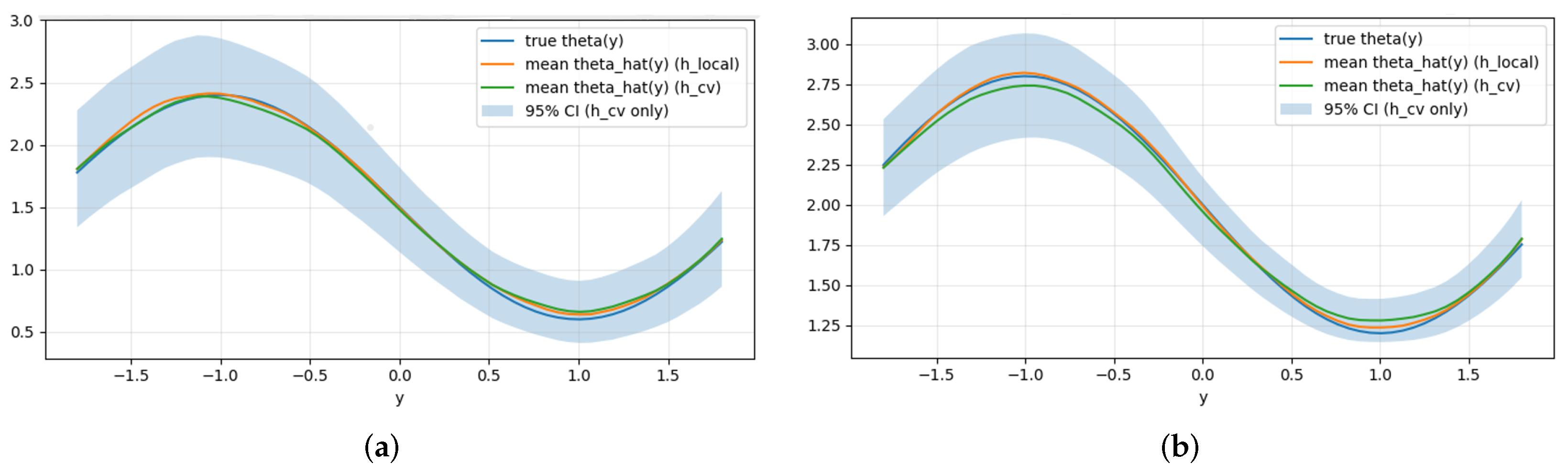 In each replication, covariate values are generated as , a truncated normal distribution with mean 0, variance 4, and support restricted to . Estimation and evaluation are restricted to the interior region and carried out on an equally spaced grid of size to mitigate boundary effects.