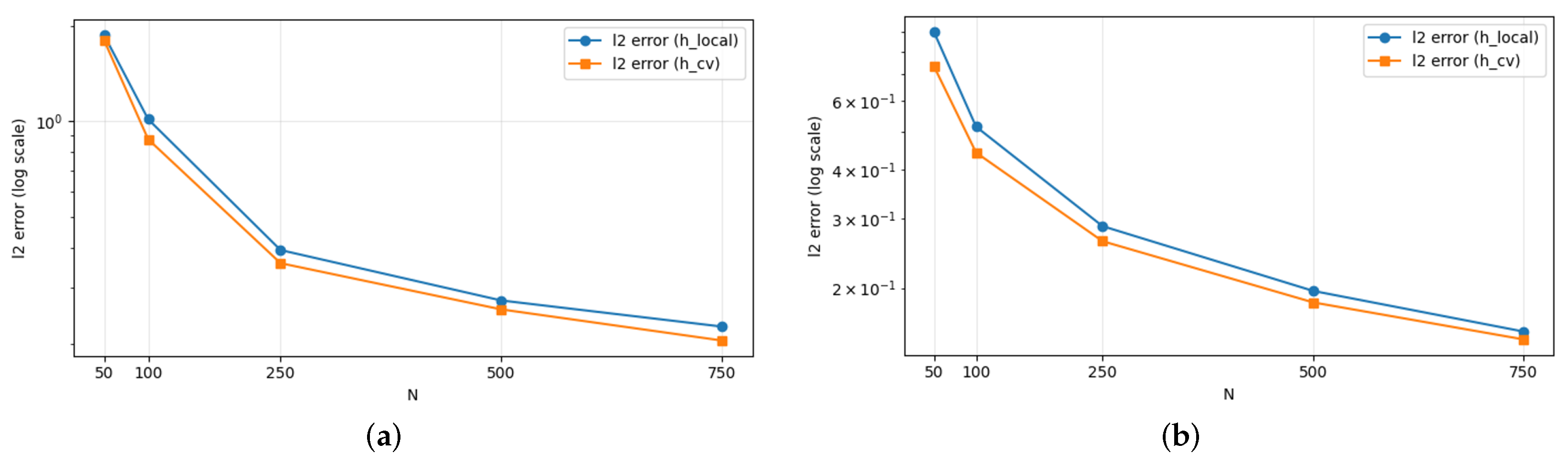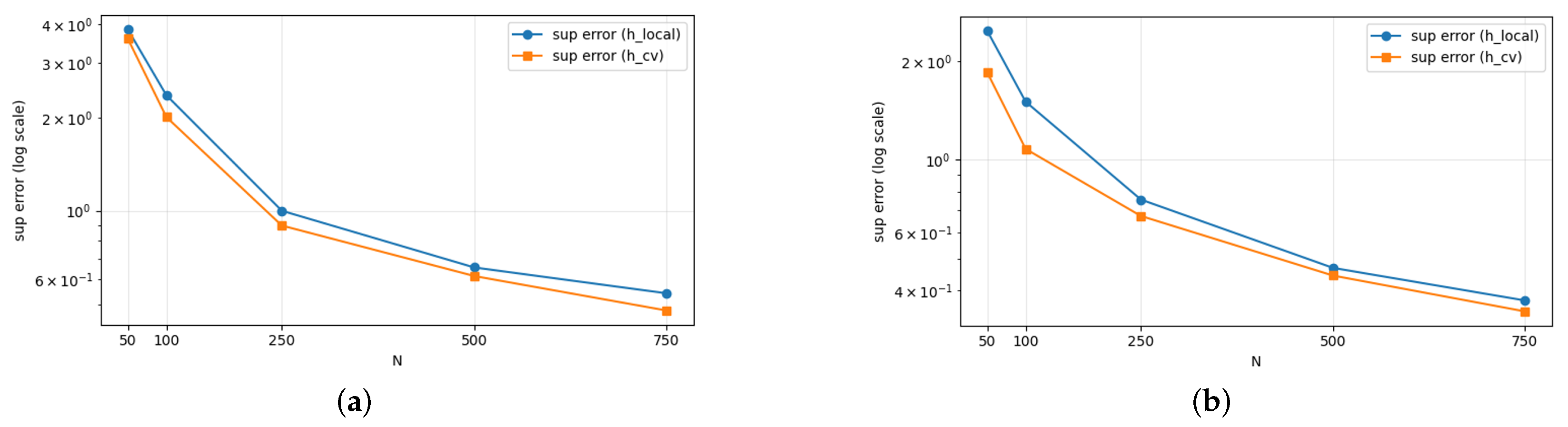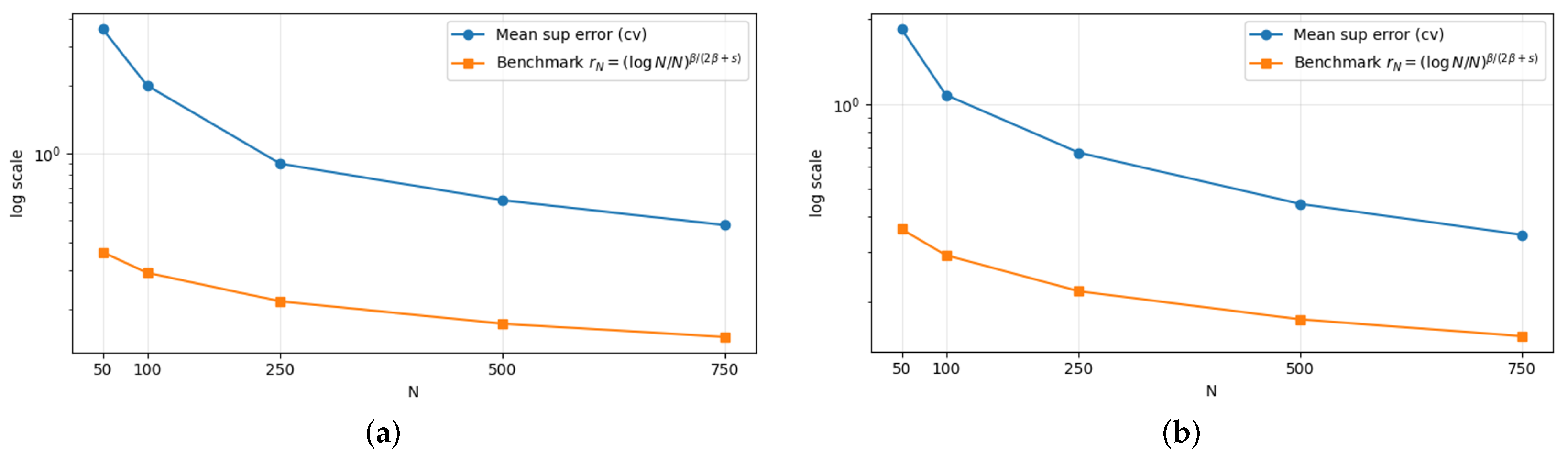 To connect the numerical results to the theoretical analysis, we report the minimax benchmark rate from Theorem 1, specialized to and , and we compare the observed sup-norm errors to in rate plots.