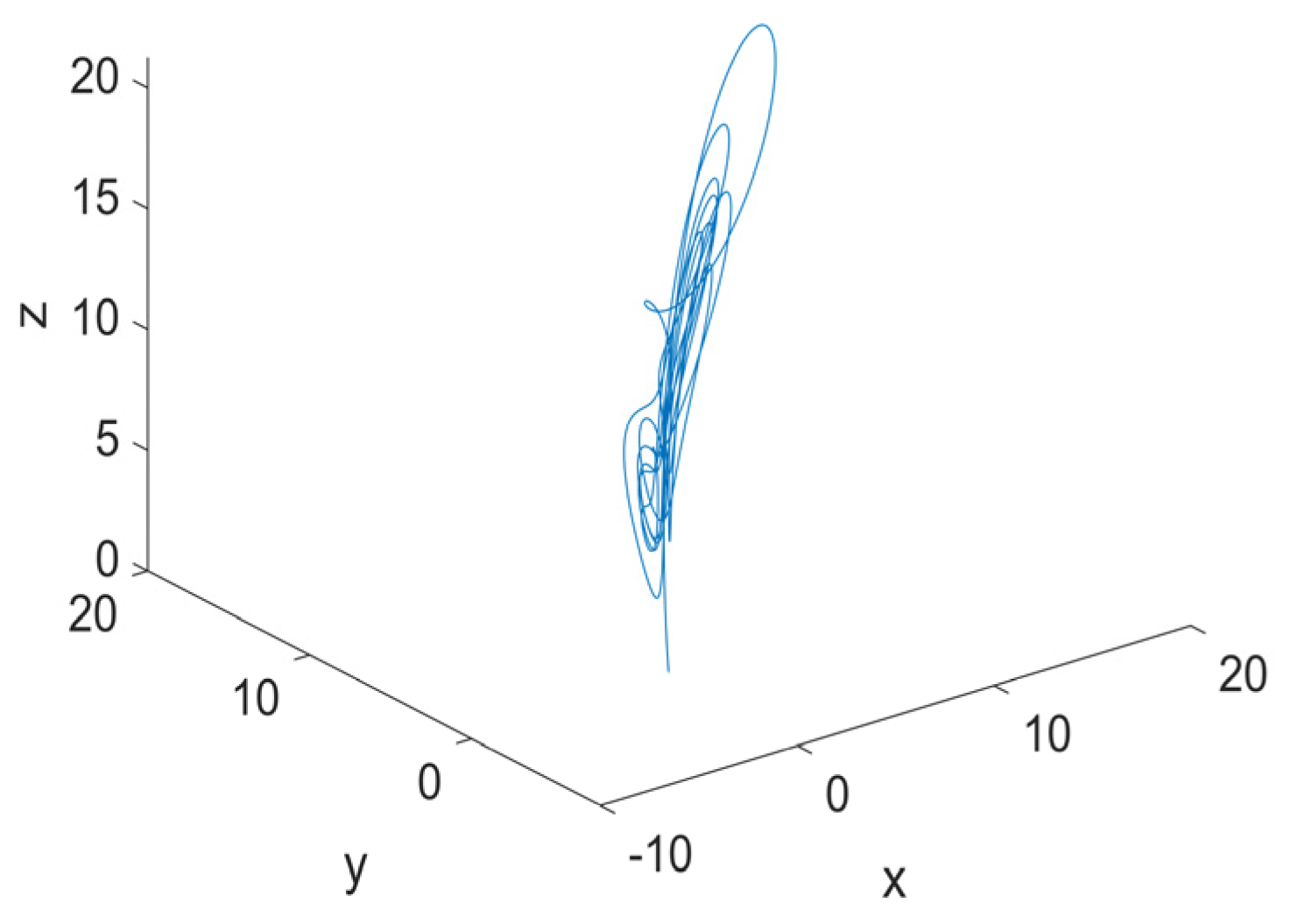 , which is derived from Equation (9) by replacing the fractional order with an integer order. The integer-order chaotic system generates fewer scroll layers along the z-axis under identical iteration conditions.