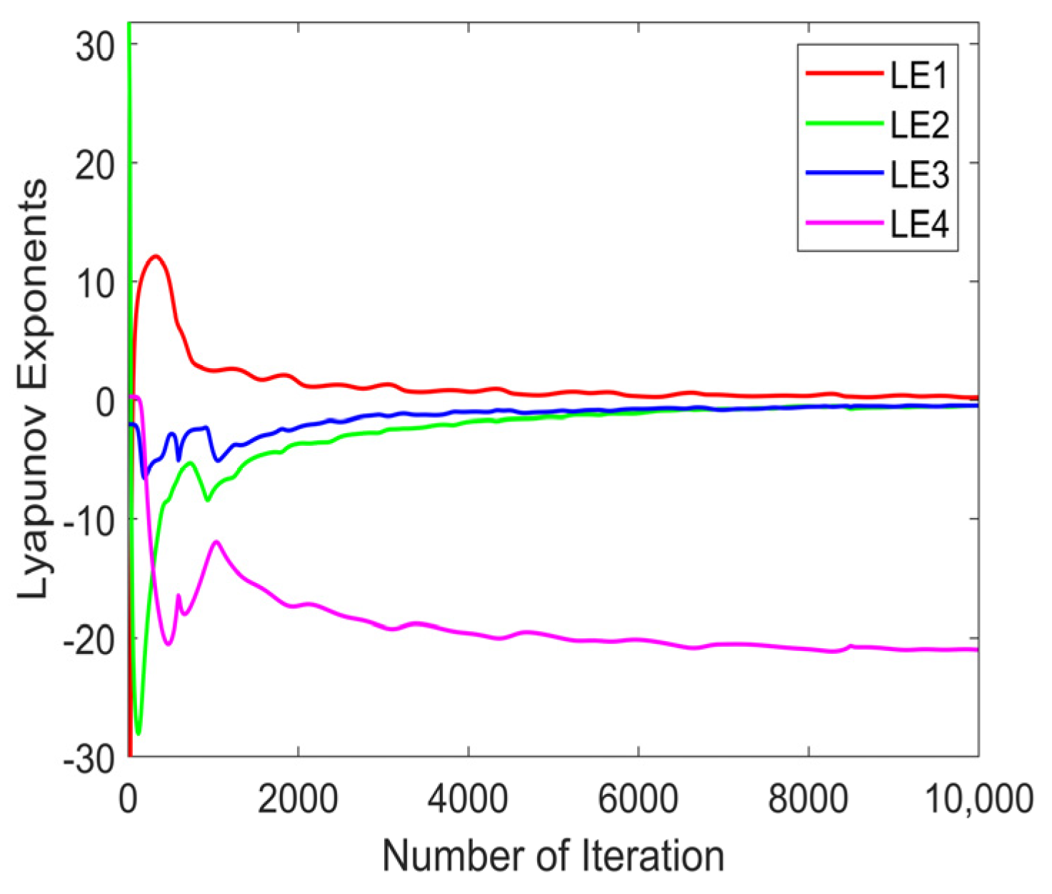 . The total number of iterations performed in this experiment is set to 10,000. The computed Lyapunov exponents for Equation (9) are