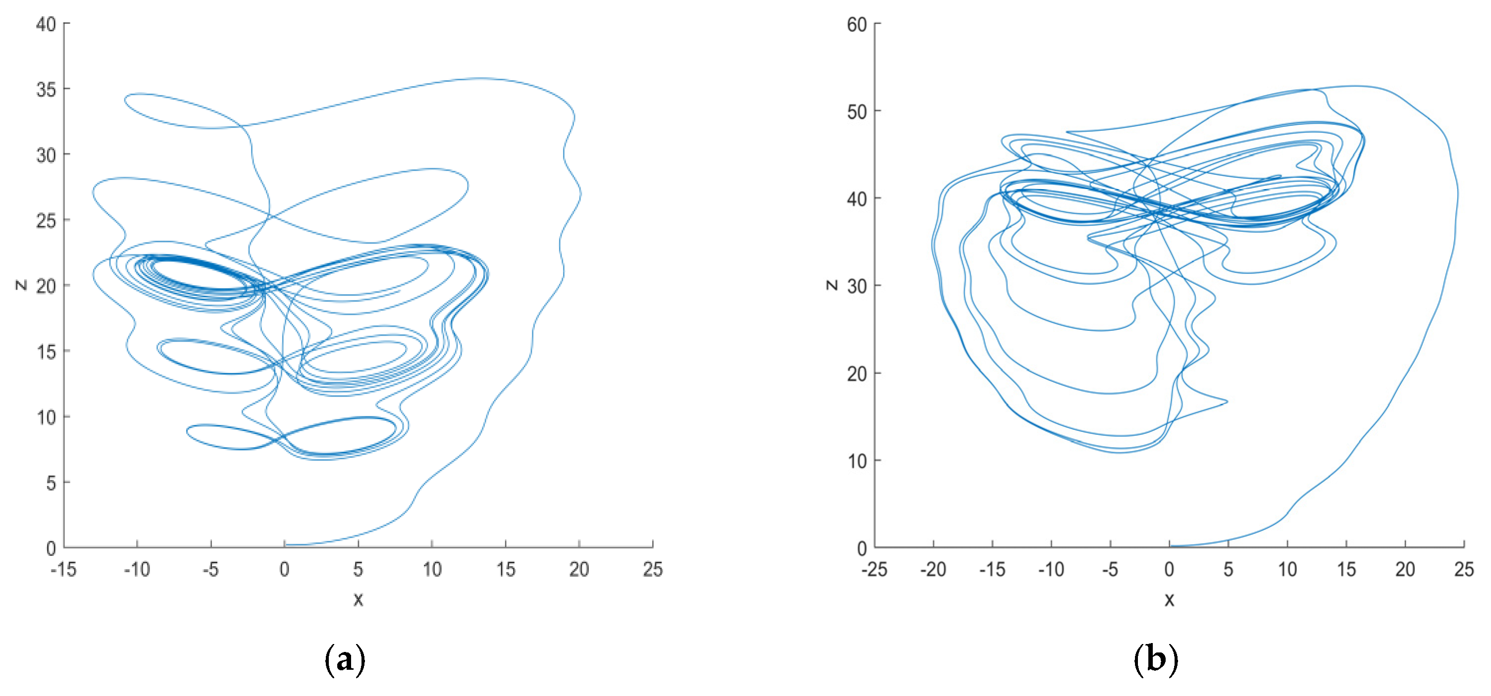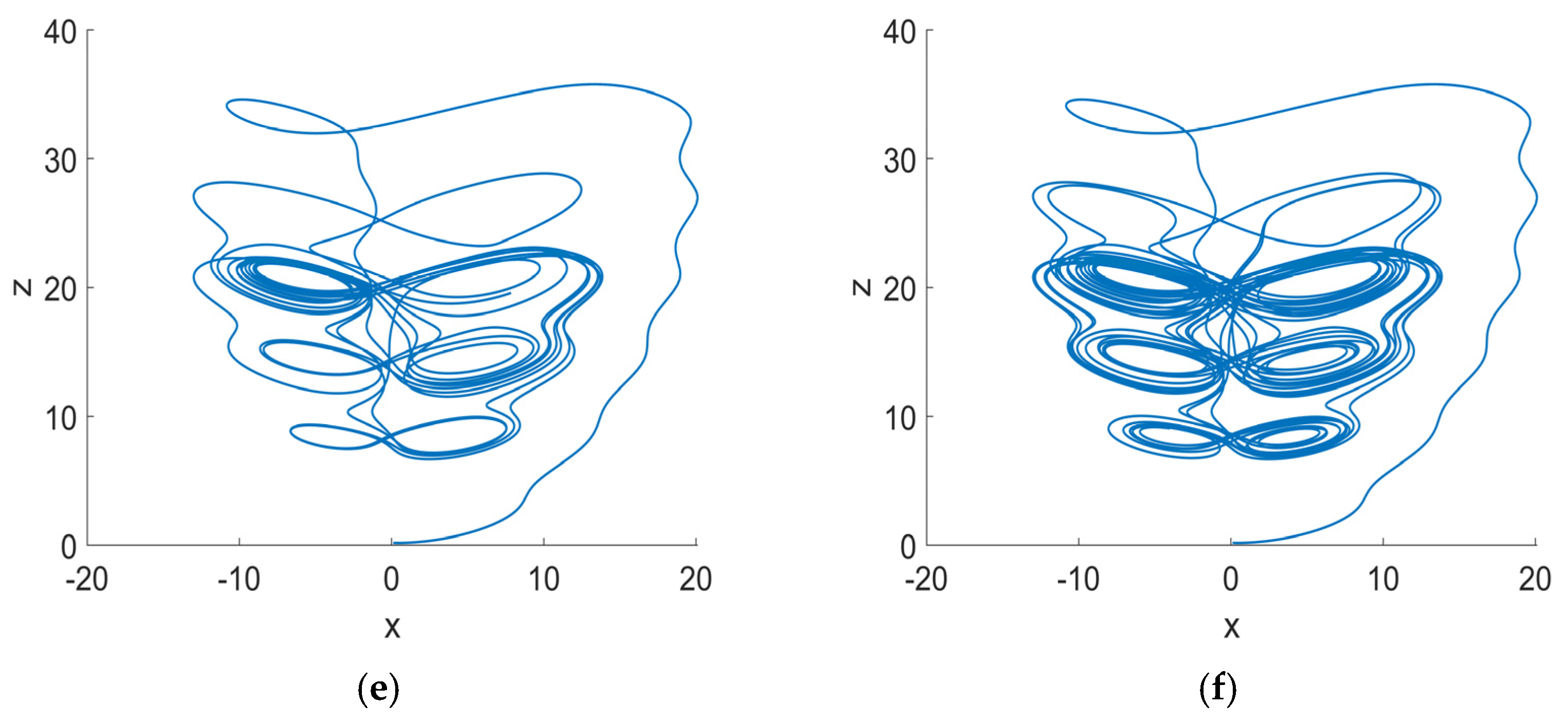 Figure 5, Equation (9) exhibits greater Lyapunov exponents compared to Equation (8). A larger Lyapunov exponent value indicates a faster rate of chaotic trajectory separation. The system state becomes completely different in a shorter time. Any small initial error will be greatly amplified. The unpredictability of the system is enhanced.