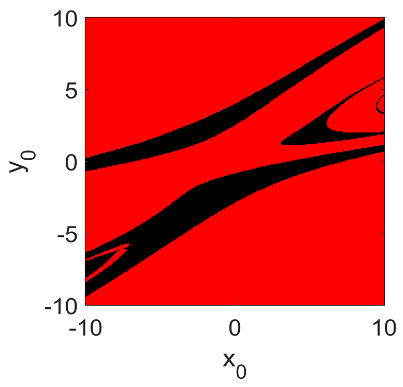 = (0, 0, 0.2, 0.5). In the figure, the red region represents initial conditions that lead the system to converge to a chaotic state, while the black region corresponds to periodic states. Furthermore,