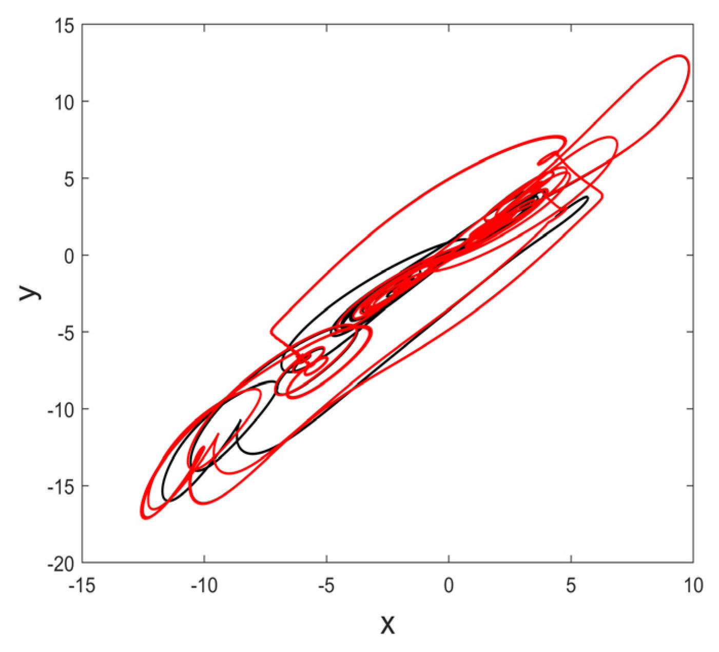 Figure 11 shows the coexisting attractor structures of the system when typical initial points are selected within these two basins of attraction. Specifically, the red trajectory corresponds to a chaotic attractor, and the black trajectory corresponds to a periodic attractor. This phenomenon indicates that even when the system parameters remain unchanged, the system can exhibit distinctly different dynamical behaviors solely by varying the initial conditions. Such a characteristic provides an additional degree of freedom in path planning, allowing different motion modes to be selected according to task requirements under the same chaotic system structure, thereby enhancing the flexibility and adaptability of trajectory generation.