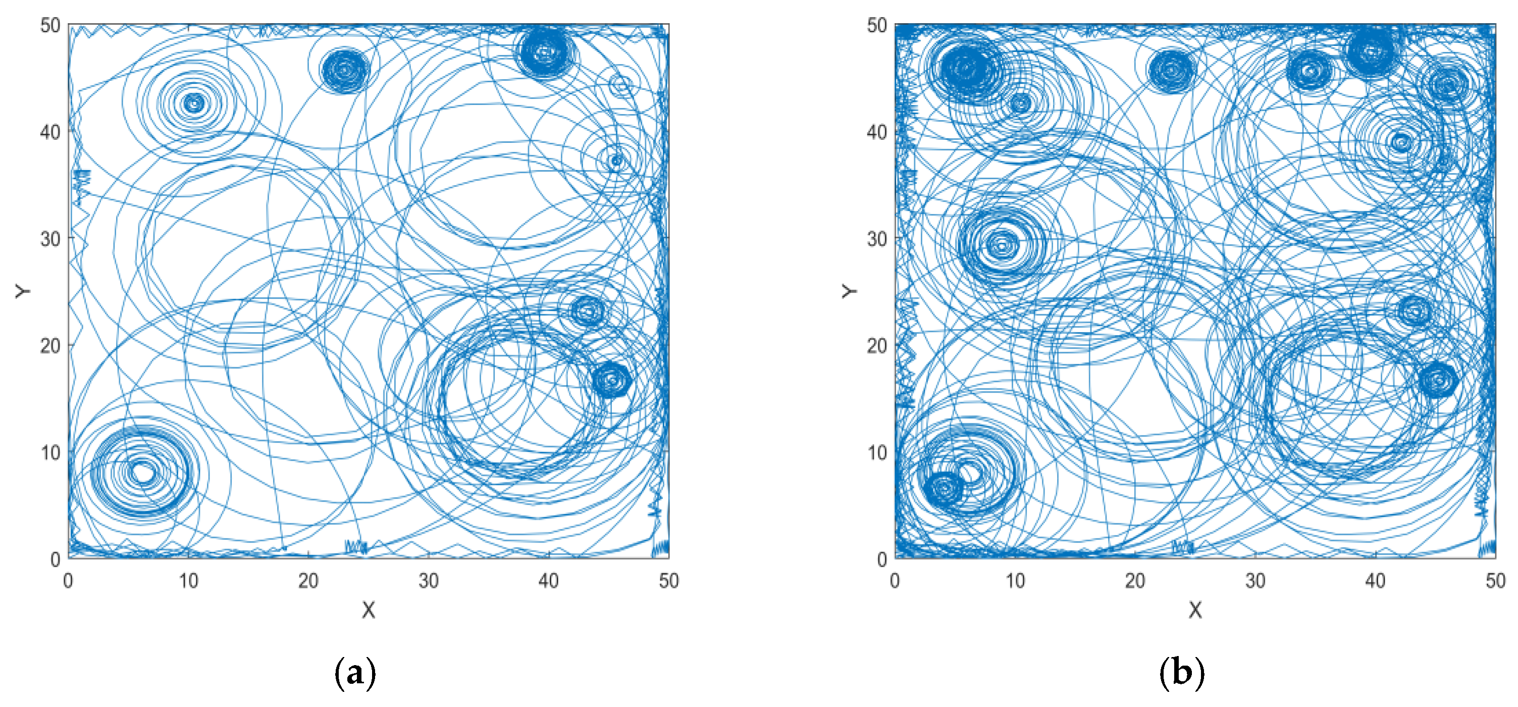 Figure 12, slight modifications to initial values generate markedly divergent trajectories after finite iterations. The greater the alteration in initial values, the more significant the trajectory divergence becomes. This property facilitates the generation of stochastic and unpredictable surveillance paths for mobile robots.