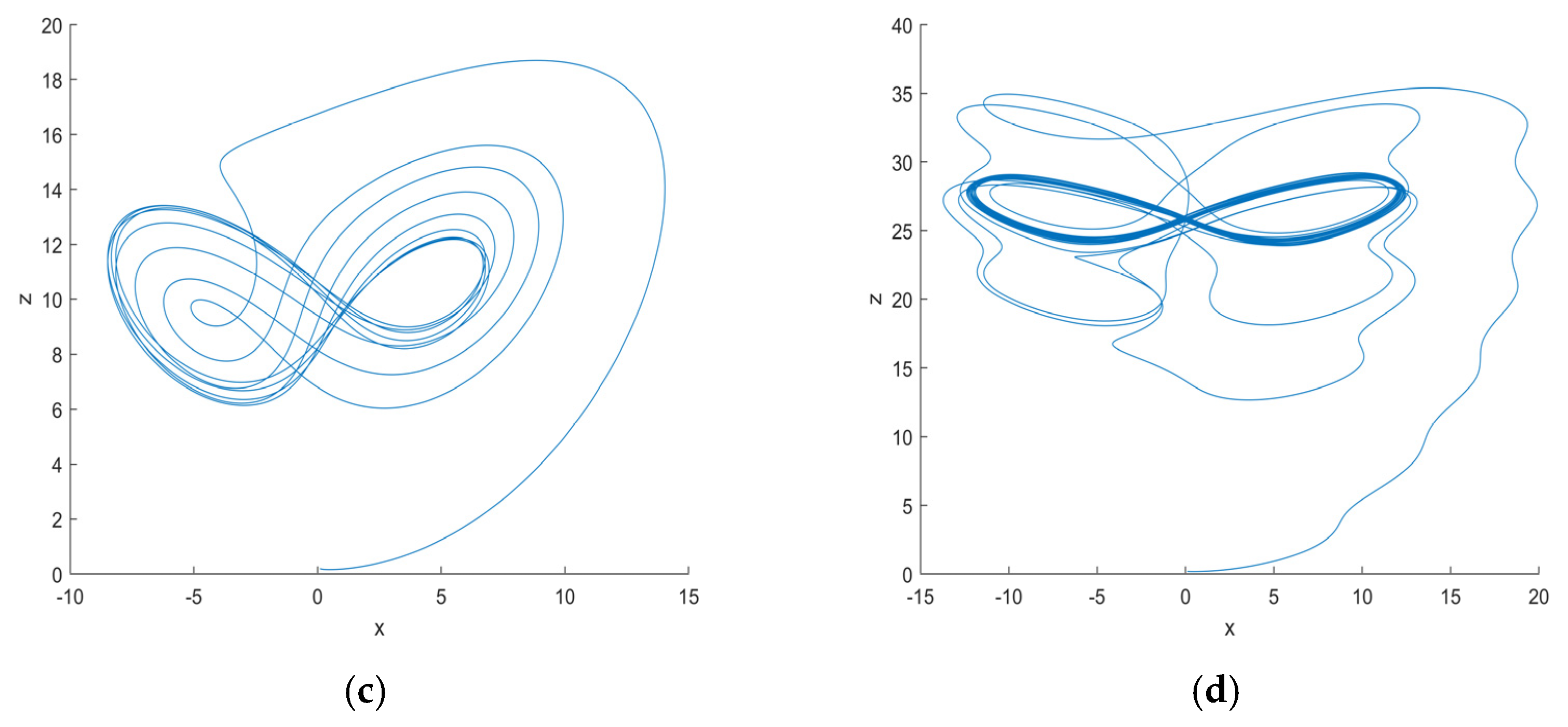Figure 11 illustrates the coexistence of periodic and chaotic attractors in the phase space of system (9). All results correspond to the parameters A = 54, B = 2, C = 30, d = −0.2, m0 = 0.4, m1 = 15, α = 0.995, β = 1.1. The initial conditions of the system are set to