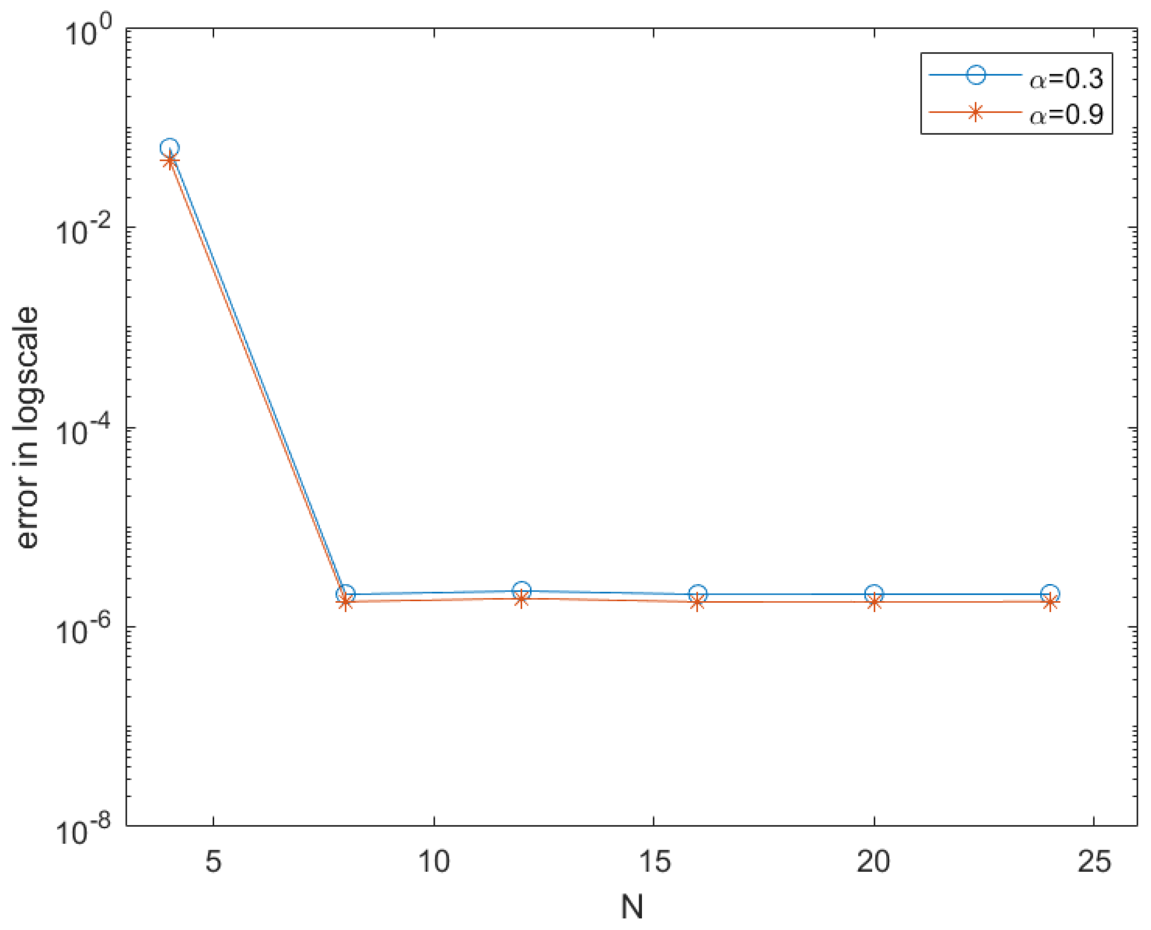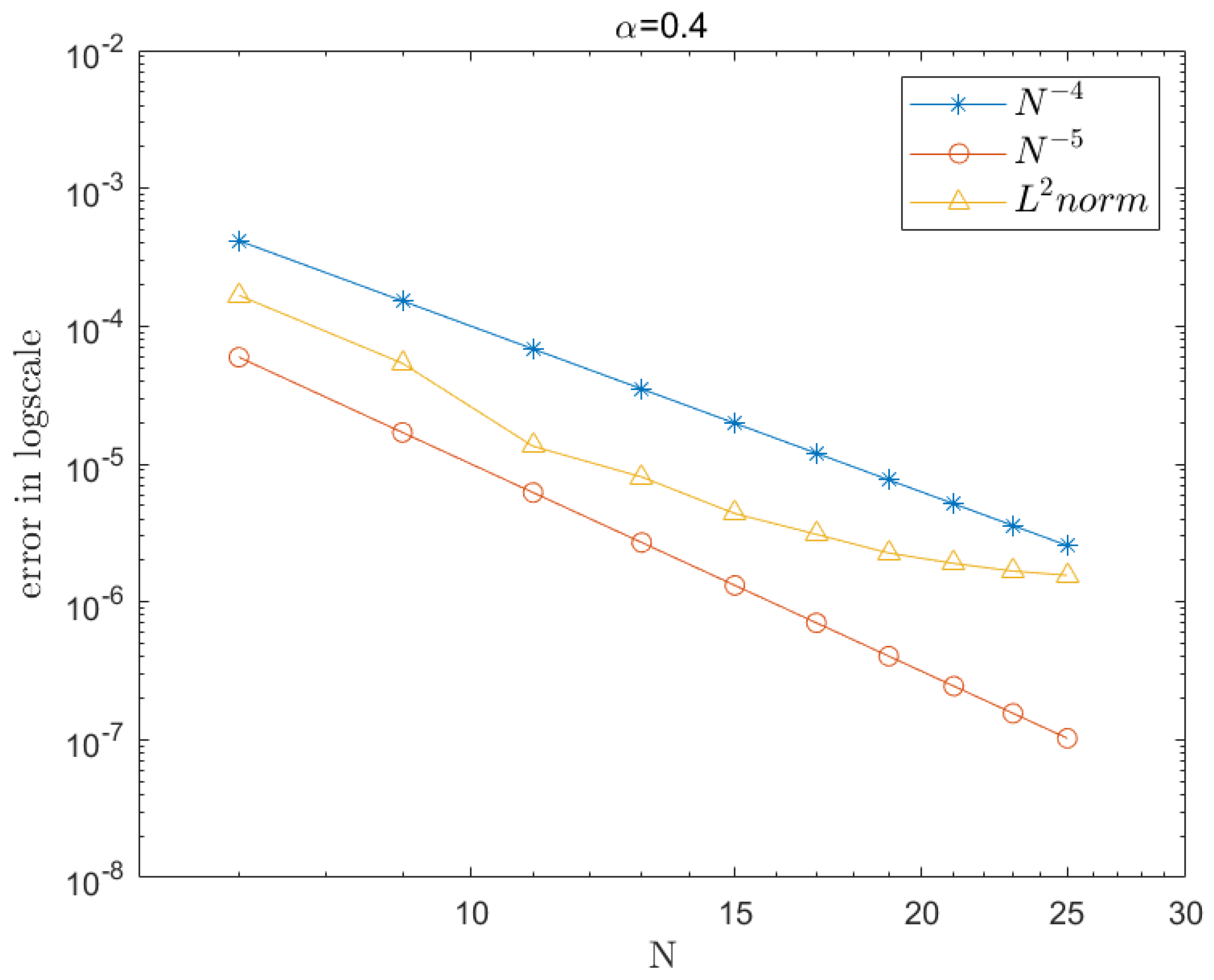 Example 1. Consider the time fractional Allen–Cahn equation with a smooth solution :where and We first consider the temporal accuracy. To avoid the influence of spatial discretization, we take