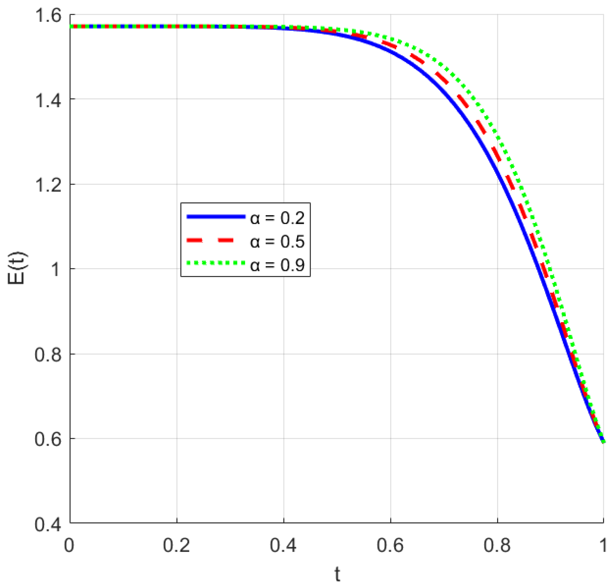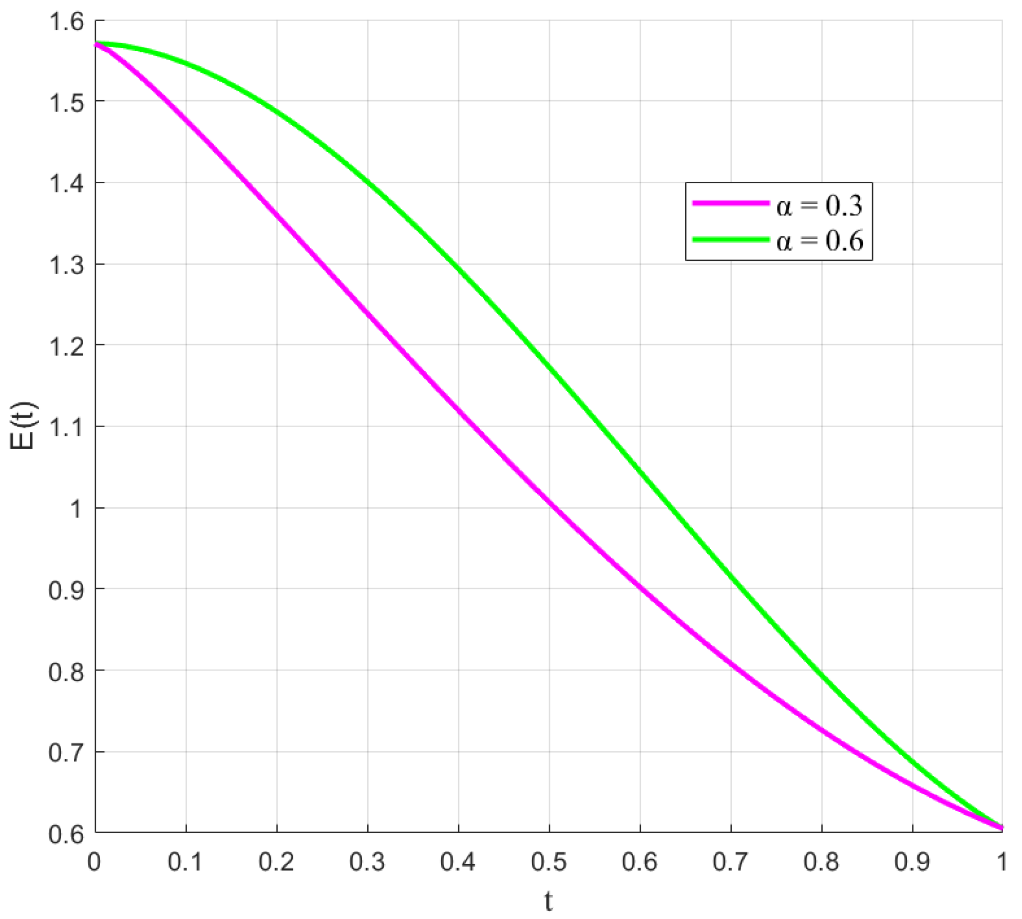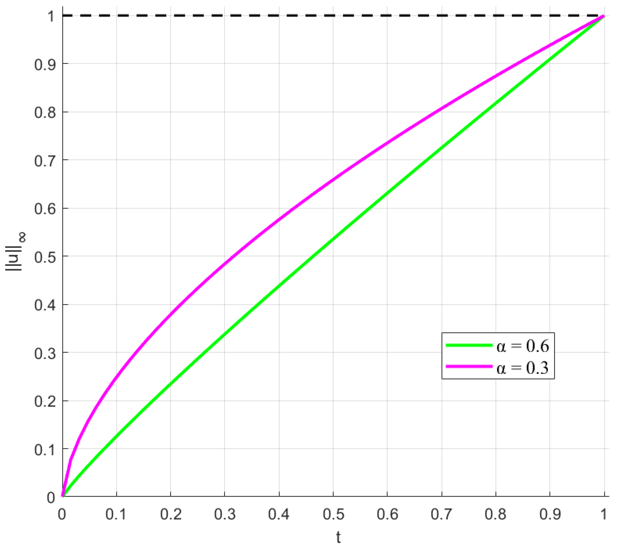 Example 3. Consider the time fractional Allen–Cahn equation with solution :where and First, we verify the principle of maximum value and the law of energy dissipation in the scheme. Taking