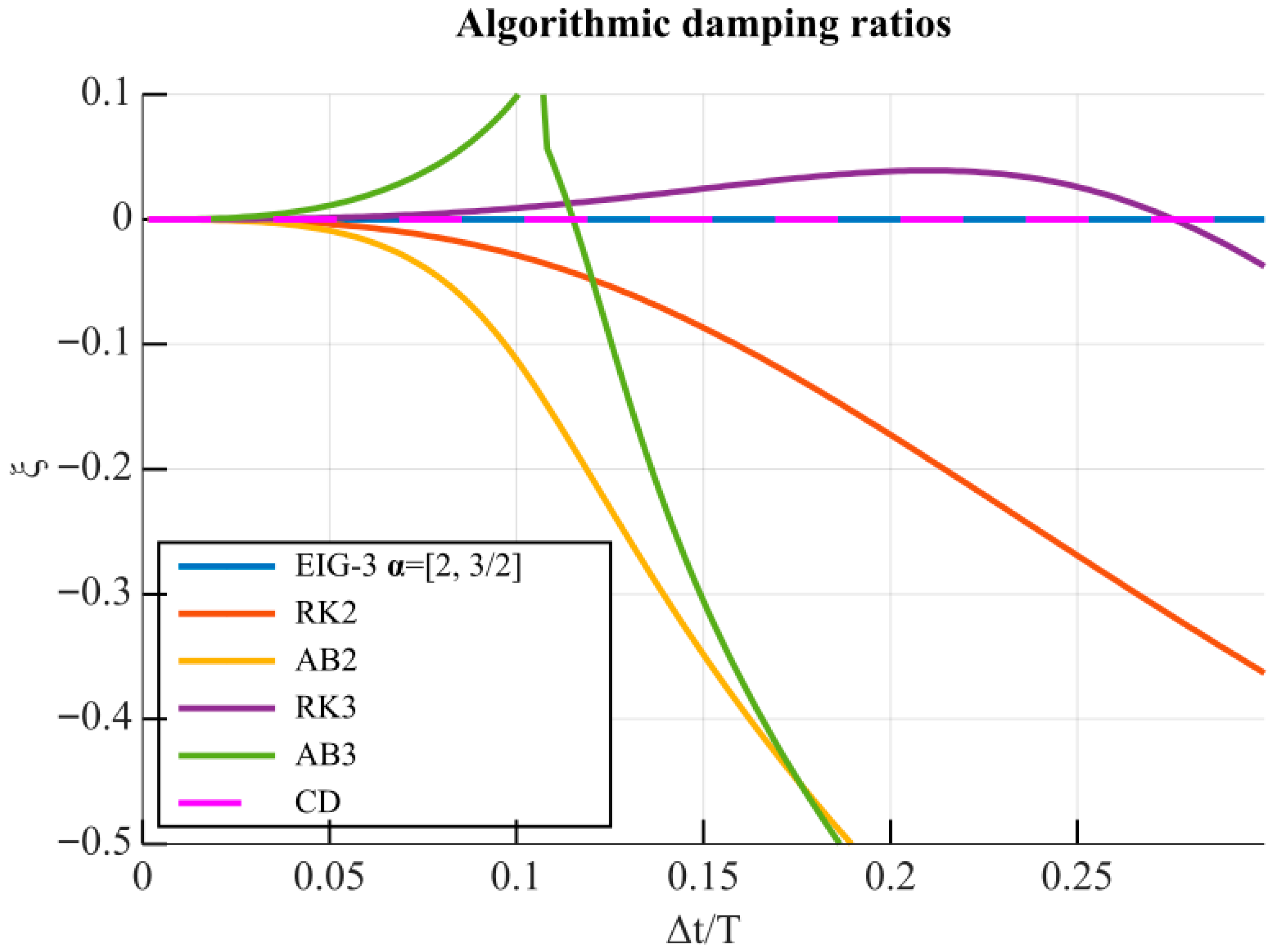 Comparison of algorithm damping ratio for different explicit integrator methods.