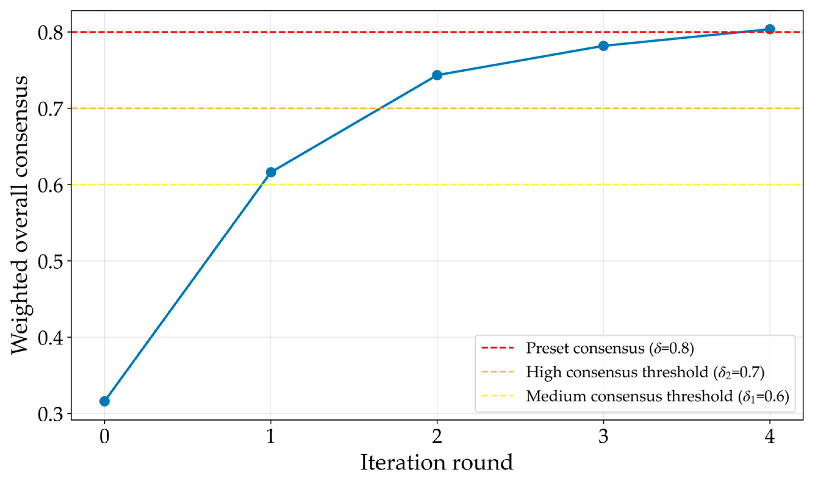 | δ1, δ2, δ | Iteration Round | Final Consensus |