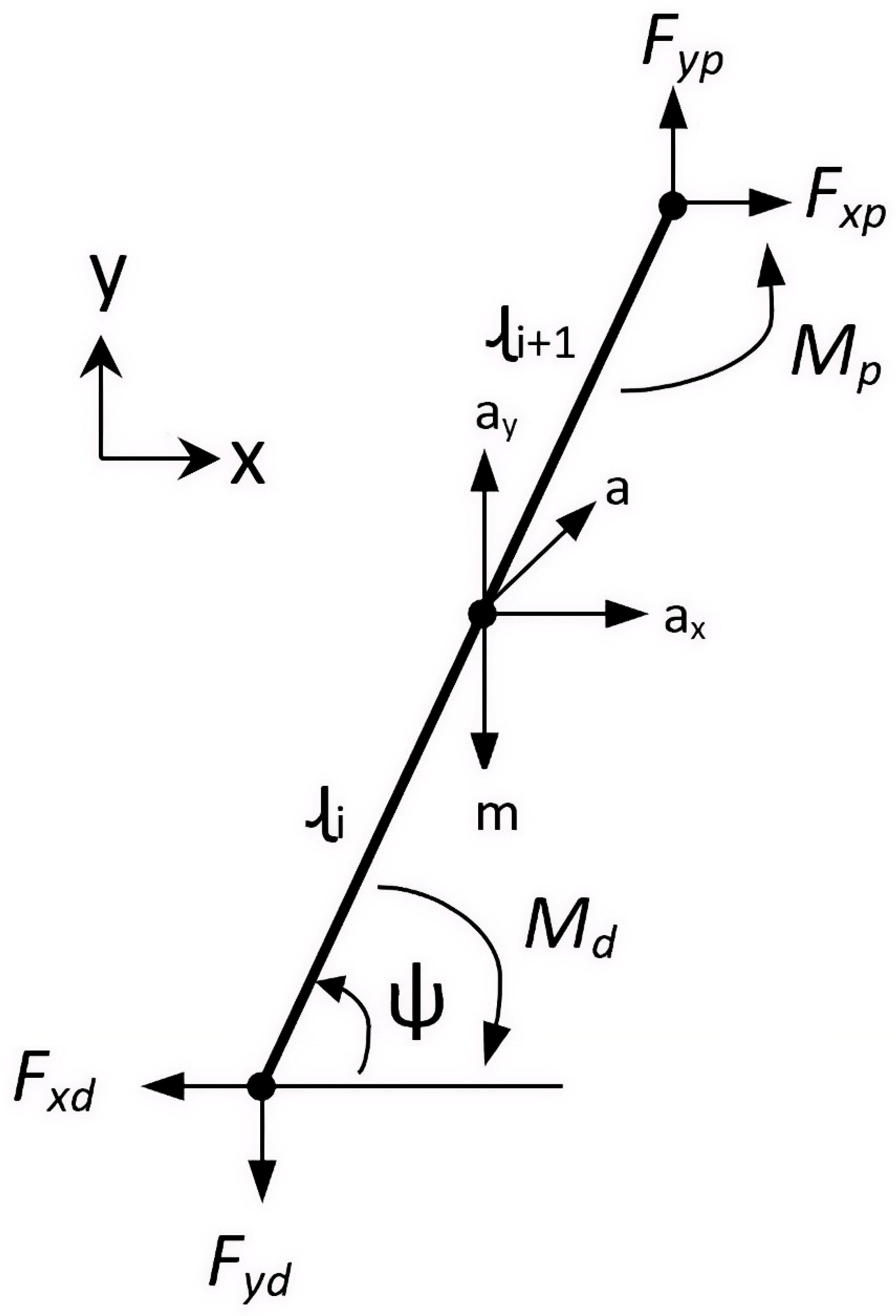 - Fxd, Fyd are the reaction forces at the distal joint, representing the known forces transferred from the preceding segment’s analysis.