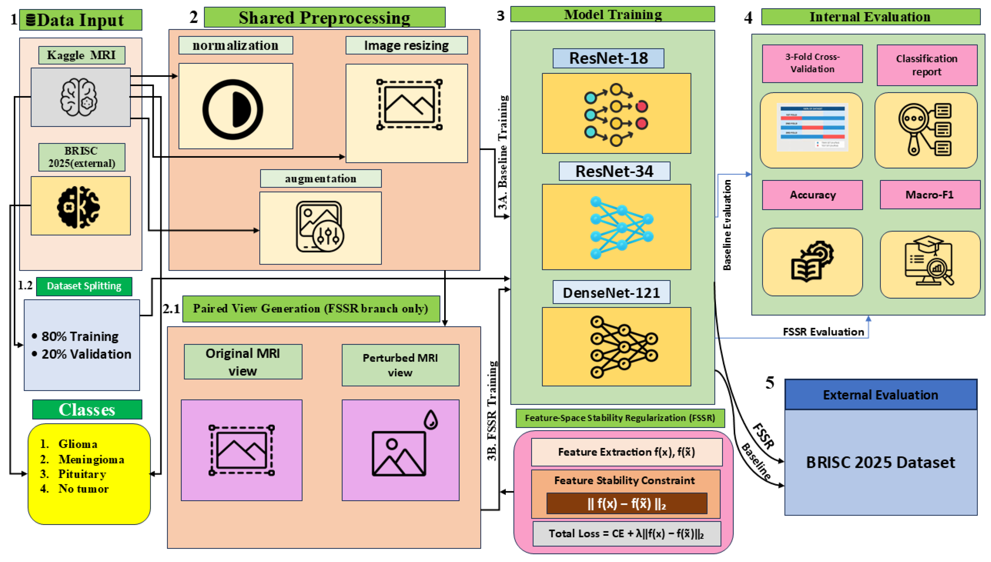 This section presents the proposed Feature Space Stability Regularization (FSSR) framework for robust brain tumor MRI classification under intensity-driven domain shift. We first describe the datasets and the problem’s formulation, followed by the preprocessing and intensity perturbation strategy. We then detail the network architectures, training objective, and optimization procedure, and conclude with the overall training framework and evaluation setup.
