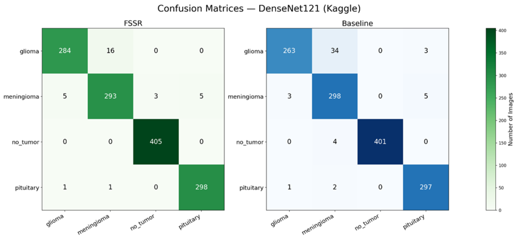 (1) Source domain performance: FSSR improves classification performance for sufficiently deep architectures. ResNet-34 achieves the best overall results (97.71% accuracy; 97.55% macro-F1), with statistically significant gains for ResNet-34 (+1.99%) and DenseNet-121 (+1.59%; ). The performance gains are primarily driven by the reduced glioma–meningioma confusion.