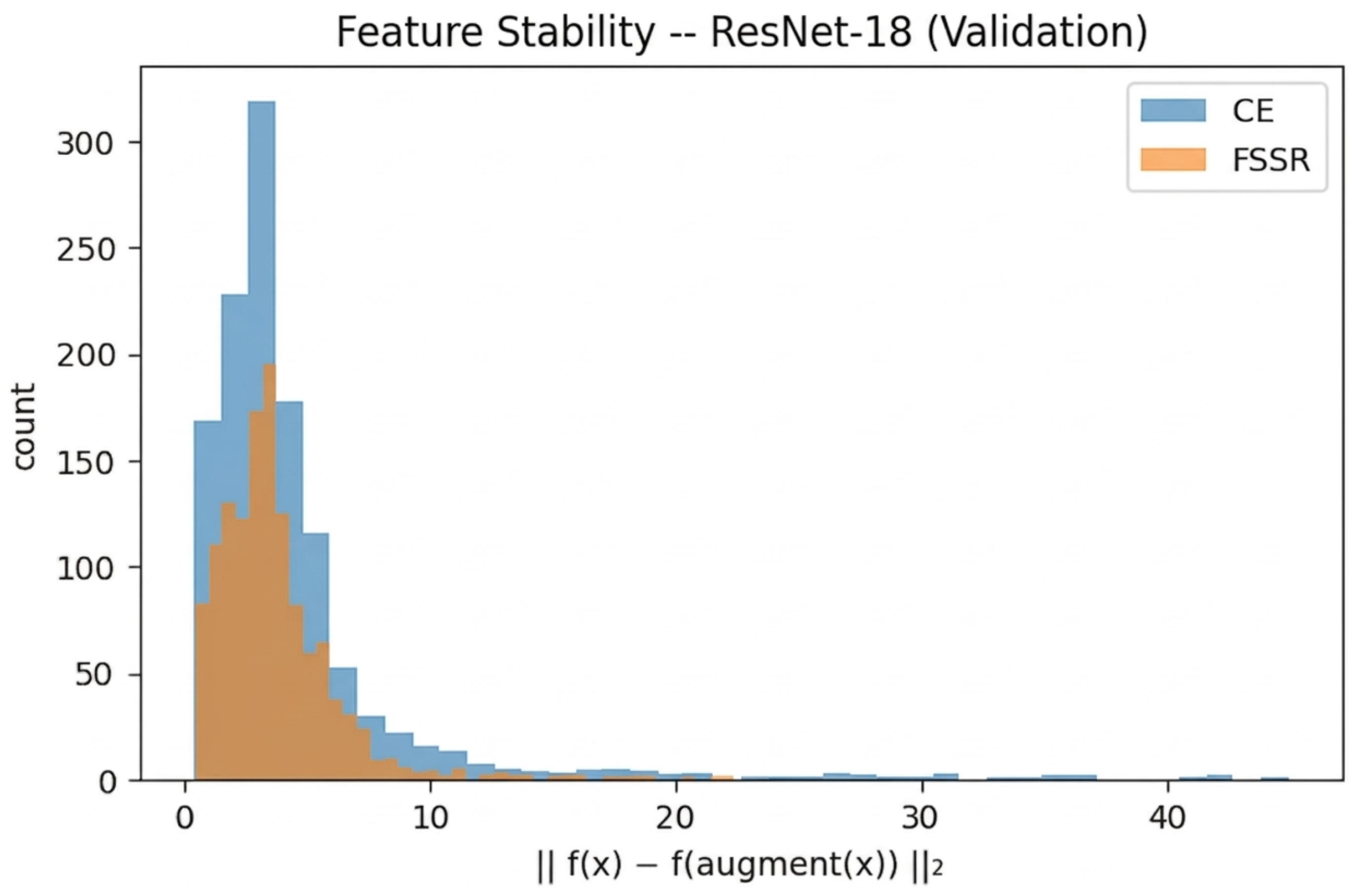 Figure 10 reveals qualitative differences in feature stability distributions. Baseline models exhibit long-tailed distributions with deviations extending beyond 40–50 units, indicating dramatic representation instability for certain inputs, likely the most vulnerable samples under domain shift. FSSR effectively eliminates these high-deviation outliers, reducing the 99th percentile deviation by approximately 60% across all the architectures.