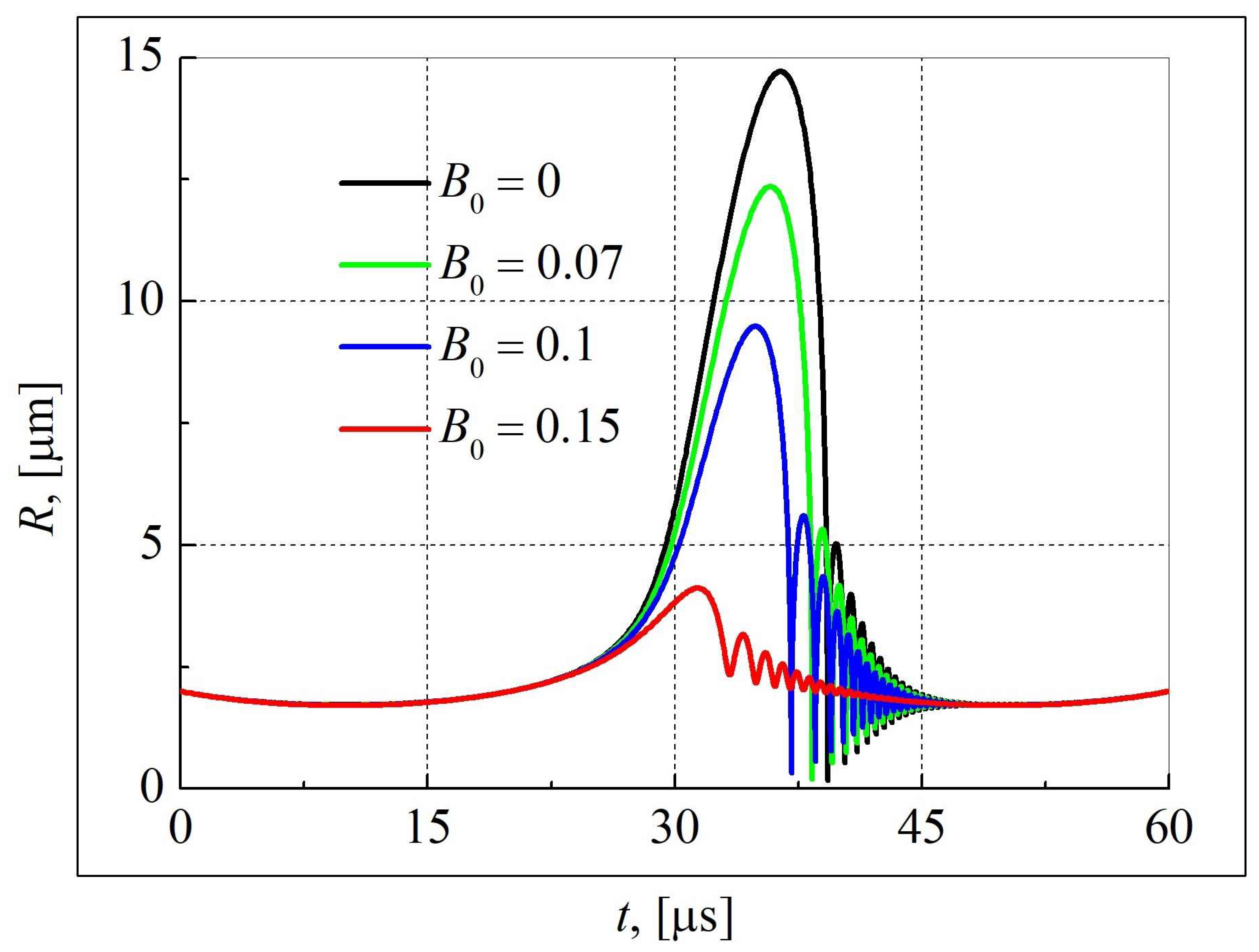 - Aliabadi, A.; Taklifi, A. The Effect of Magnetic Field on Dynamics of Gas Bubbles in Visco-Elastic Fluids. Appl. Math. Model. 2012, 36, 2567–2577. [Google Scholar] [CrossRef]