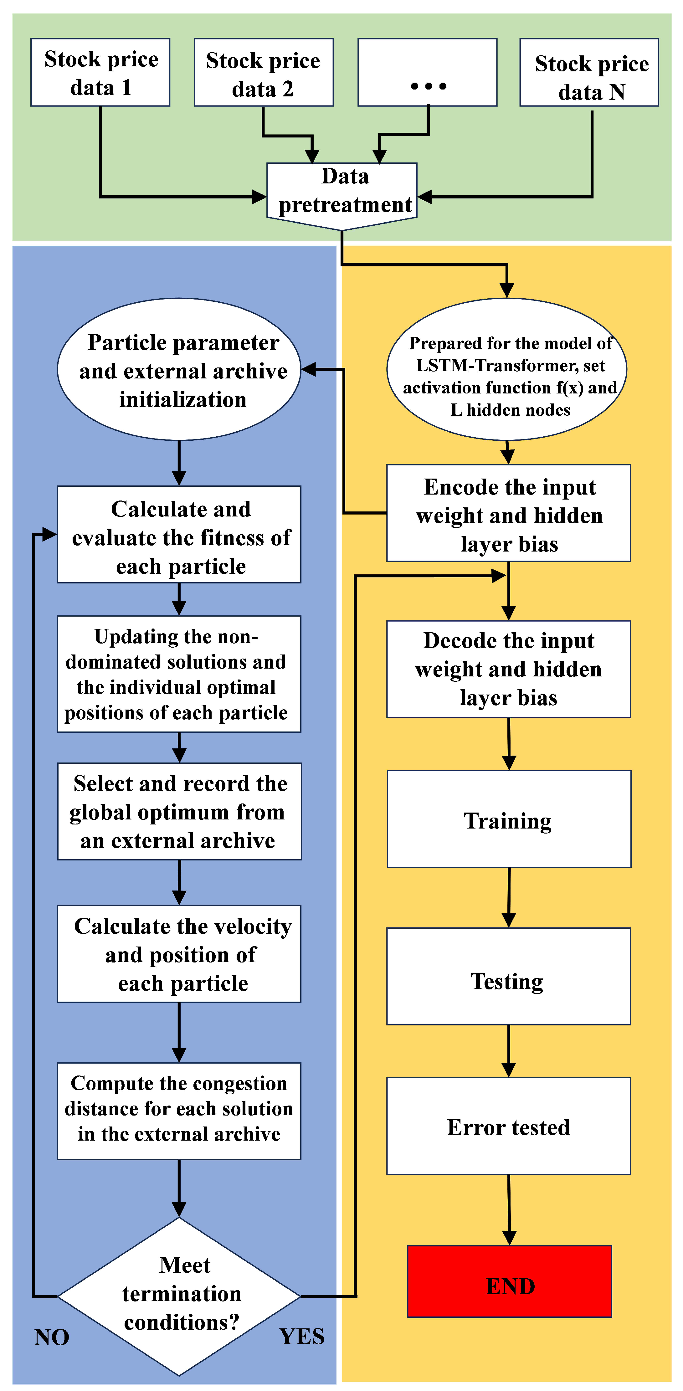 Specifically, this metric quantifies how isolated a particle is within the objective space. Particles with larger crowding distances are preferred during selection, ensuring that the optimizer explores a broad range of trade-offs between MAPE and RMSE rather than collapsing to a single narrow region. Accordingly, the final optimal solution is selected from the external archive based on the maximum crowding distance. This selection strategy is prioritized to enhance the diversity of the swarm’s search space, preventing the model from over-fitting to a specific localized error pattern. This mechanism ensures that the chosen configuration of LSTM and Transformer components is both empirically optimized and theoretically stable under volatile market conditions.