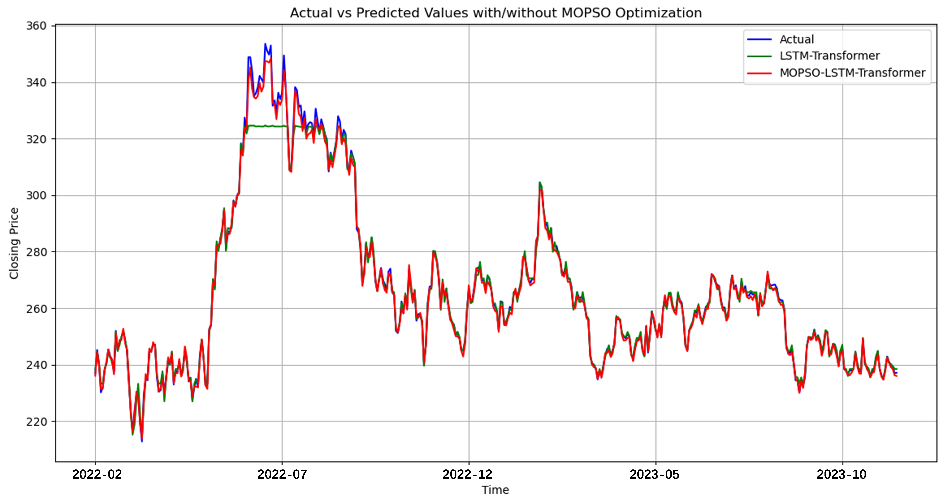 The incorporation of MOPSO further enhances predictive accuracy by enabling a data-driven search for optimal hyperparameters. Manual tuning of hybrid architectures is typically subjective and prone to suboptimal configurations, especially given the complex interactions among LSTM hidden sizes, attention heads, embedding dimensions, expansion ratios, dropout rates, and learning rates. MOPSO addresses this challenge through a multi-objective evolutionary search that jointly minimizes prediction error and improves model stability. The resulting configuration yields a more expressive and better-calibrated model, as reflected in the significant reductions in MAE, RMSE, and MAPE, and the near-perfect score achieved on the test set.