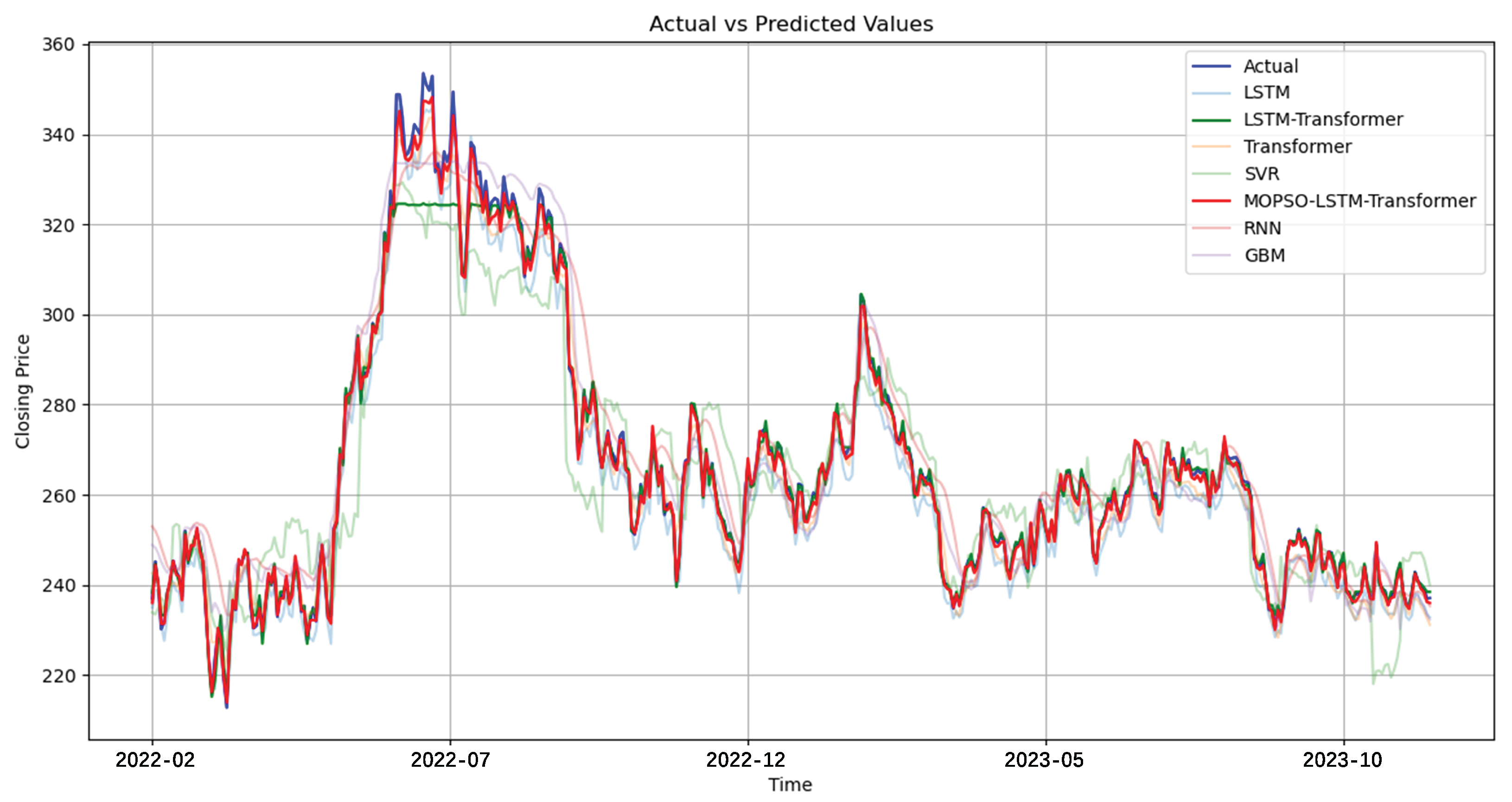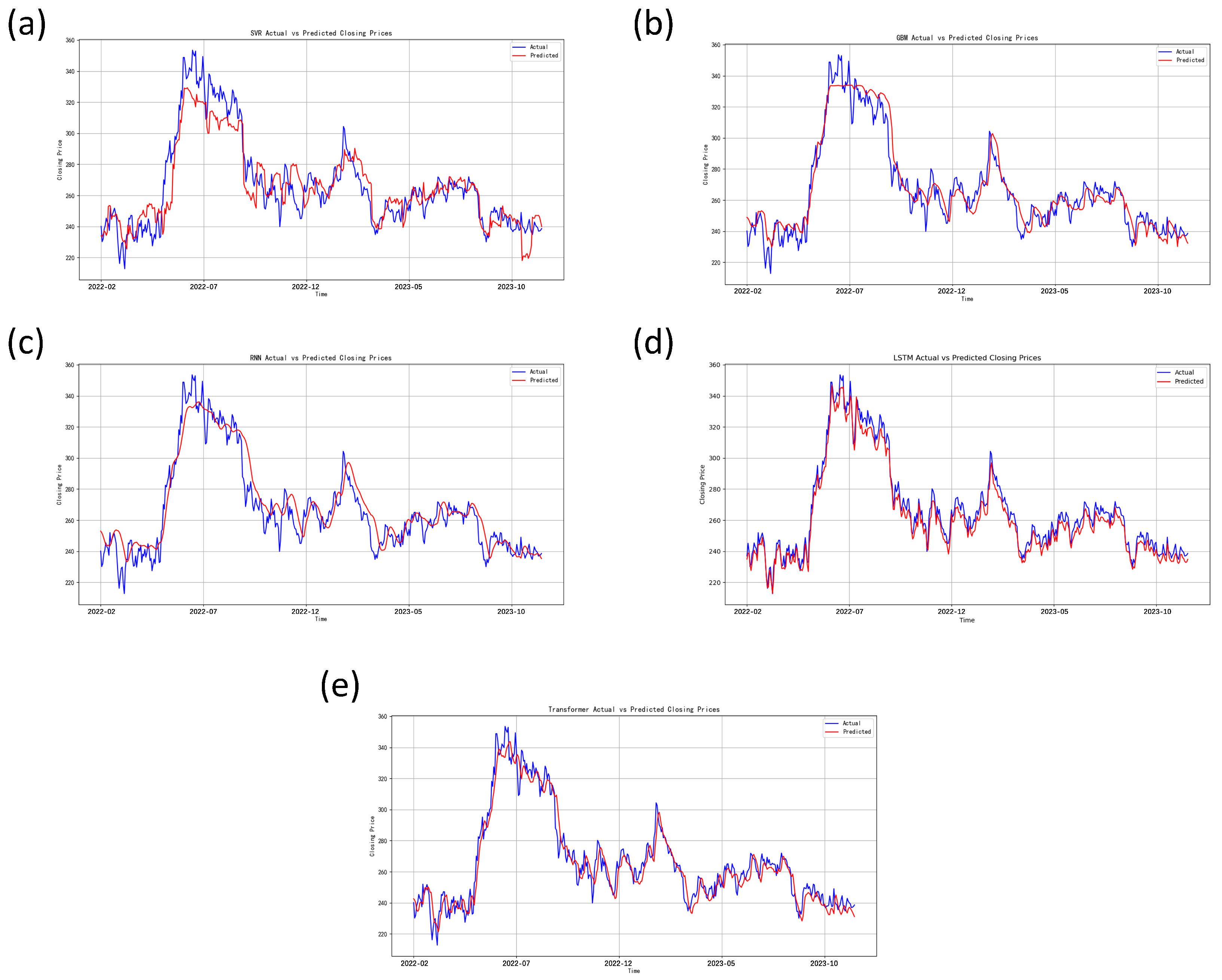 To further assess the effectiveness of the proposed FATE-Net framework, its predictive performance is compared with several widely used baseline models, including Support Vector Regression (SVR), Gradient Boosting Machine (GBM), Recurrent Neural Network (RNN), Long Short-Term Memory (LSTM), Transformer, and the unoptimized LSTM–Transformer hybrid. These models represent classical machine learning approaches, recurrent architectures, attention-based architectures, and hybrid deep learning baselines, providing a comprehensive benchmark for evaluating the advantages of the proposed method.