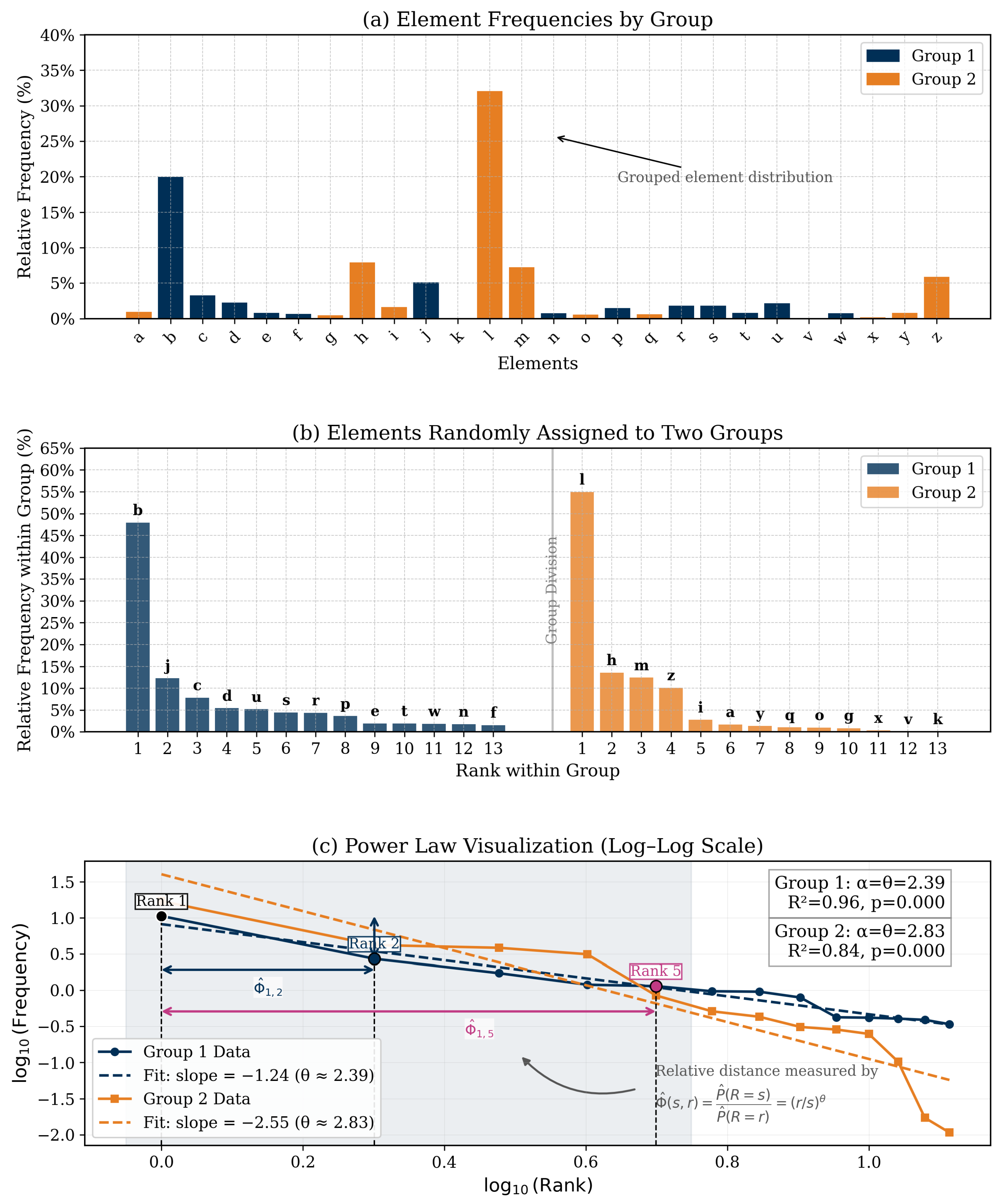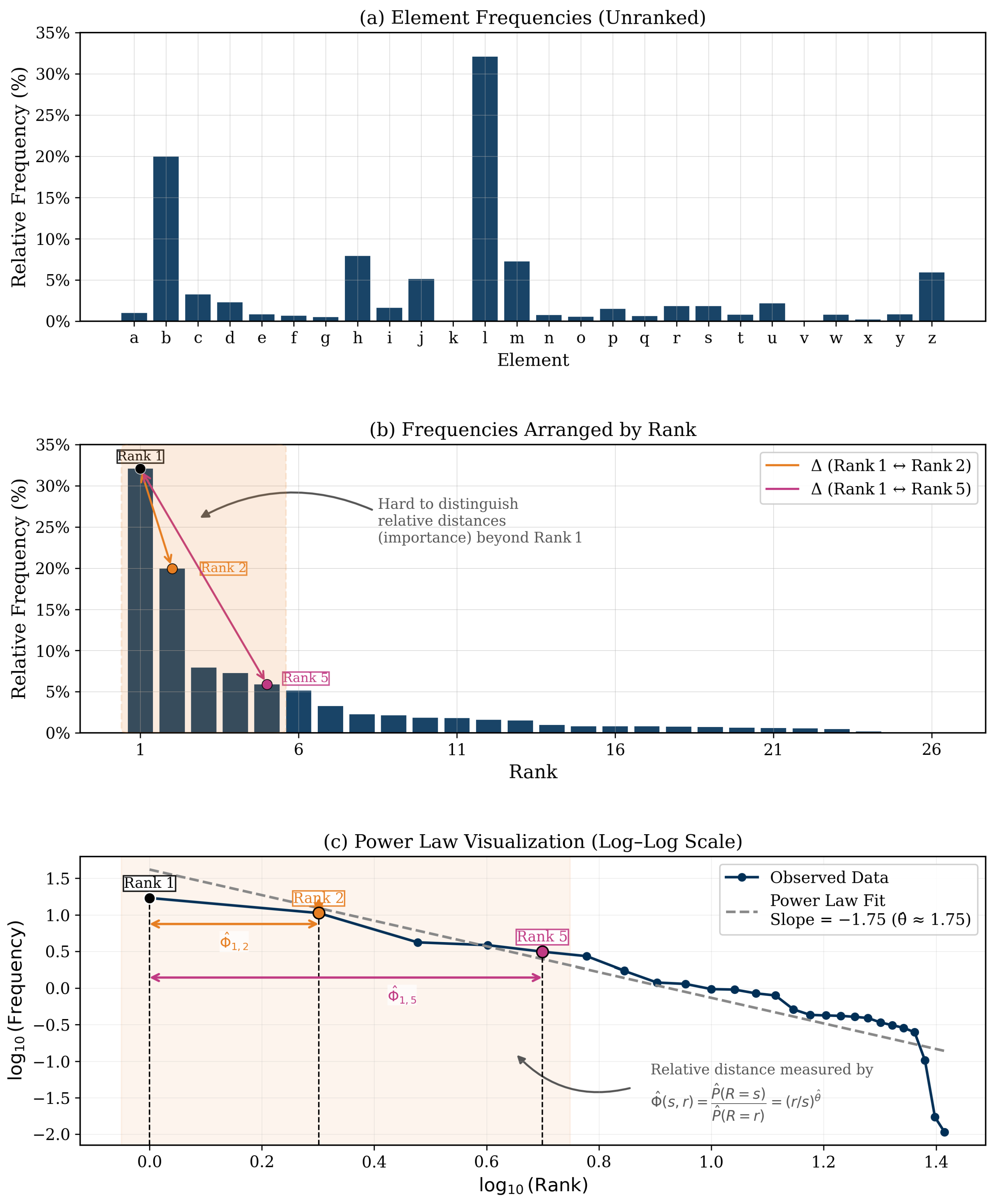 This limitation becomes particularly evident when frequency-based rankings are used to order categorical elements, as they provide limited insight when frequency differences are small or identical. For example, while large disparities (e.g., 50 vs. 10) suggest clear dominance, it is far more difficult to determine relative importance when frequencies are equal (e.g., 40 vs. 40) or nearly so (e.g., 40 vs. 38). In such cases, frequency becomes an unreliable signal, offering no clear justification for ranking one element above another. This challenge is particularly salient in power-law distributed systems, where many mid- and low-ranked elements play meaningful roles despite having similar occurrence rates. Thus, relying solely on frequency can obscure structural relevance. These challenges point to the need for a principled, mathematically grounded approach to comparing elements not just by how often they occur, but by how their frequency relates to the overall distribution. A rank-aware perspective (rooted in power-law modeling) enables clearer differentiation, especially in cases of small frequency deltas, and strengthens our capacity to capture hierarchical importance within complex systems.