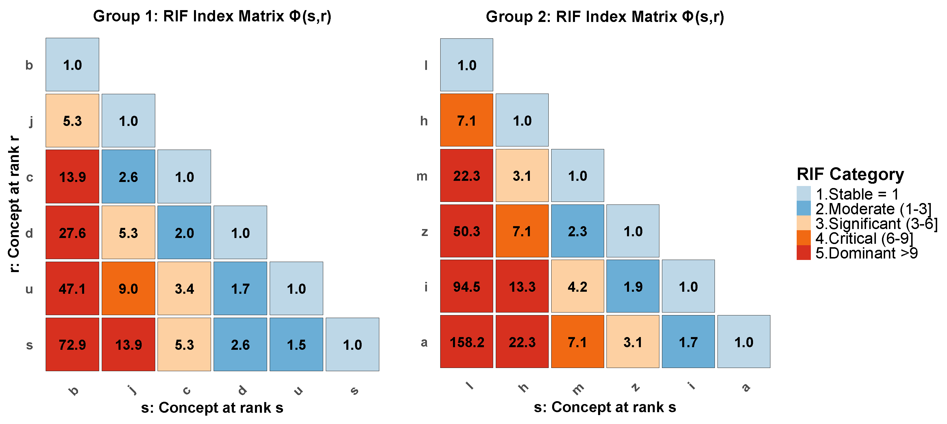. For example, an RIF value of 5 means the top-ranked concept is five times more dominant than the compared concept under the modeled distribution.