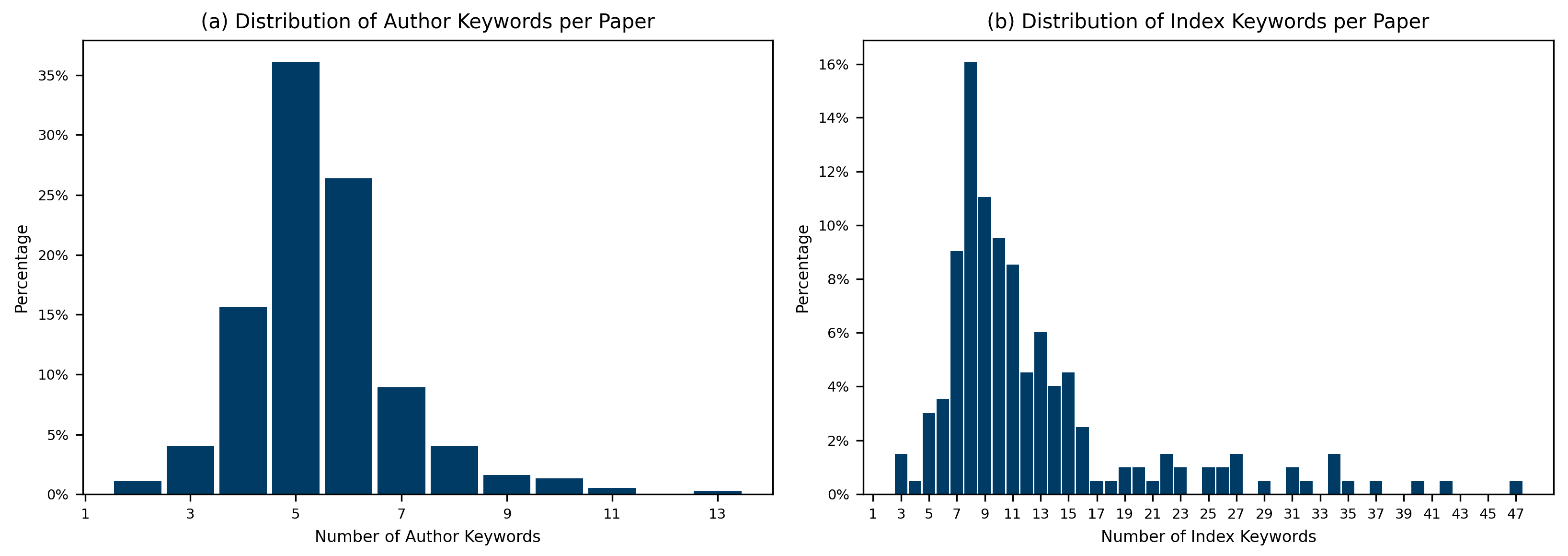 The results further confirmed that keyword frequencies, particularly among index terms, follow a power-law distribution, where a few concepts dominate while most appear infrequently. This aligns with prior findings in academic publishing research [
