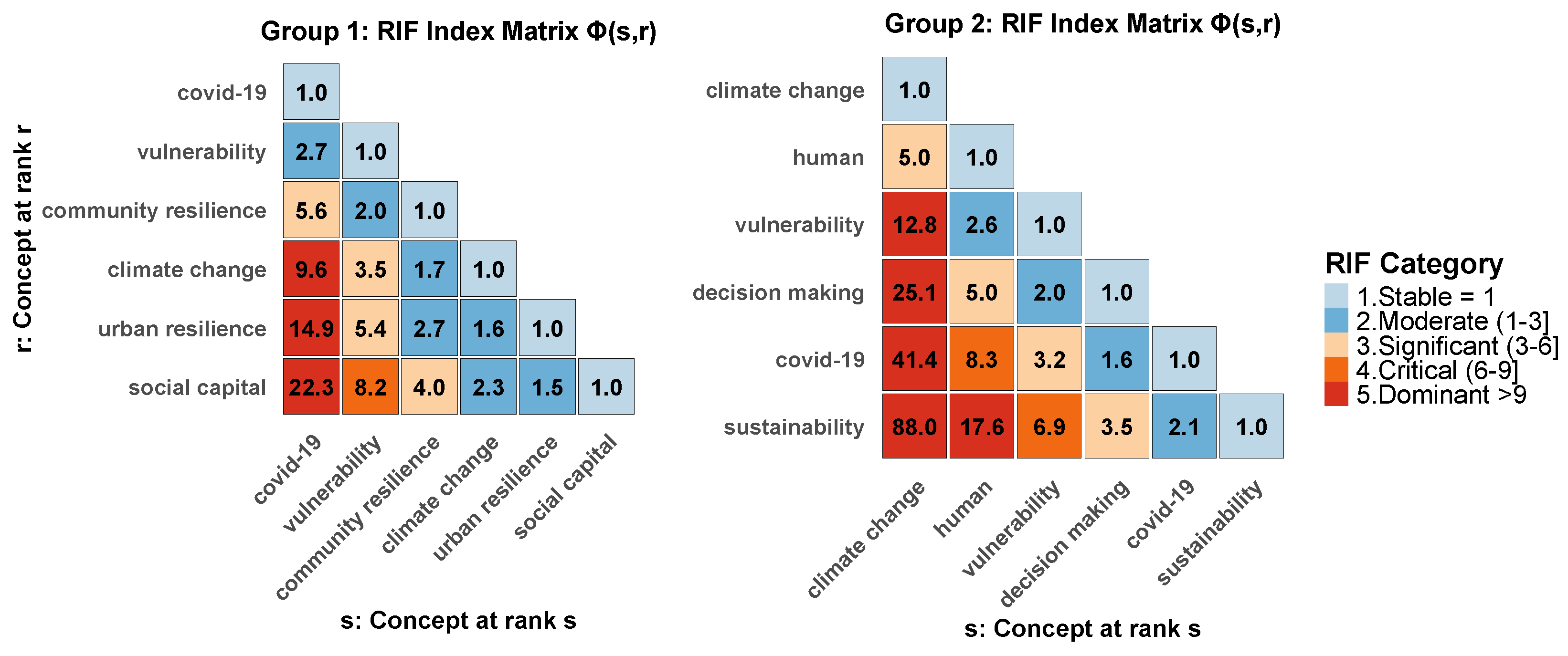 A similar pattern is observed with sustainability (rank 6), which exhibits high RIF values in the Dominant range when compared to all higher-ranked concepts. Rather than implying marginality, this suggests a more focused or domain-specific presence within the discourse, perhaps associated with long-term policy and development goals. Additionally, lower-ranked keywords with sustained presence but weaker dominance, such as adaptive management or disaster management, may signal emergent or niche research areas gaining conceptual traction within the field.