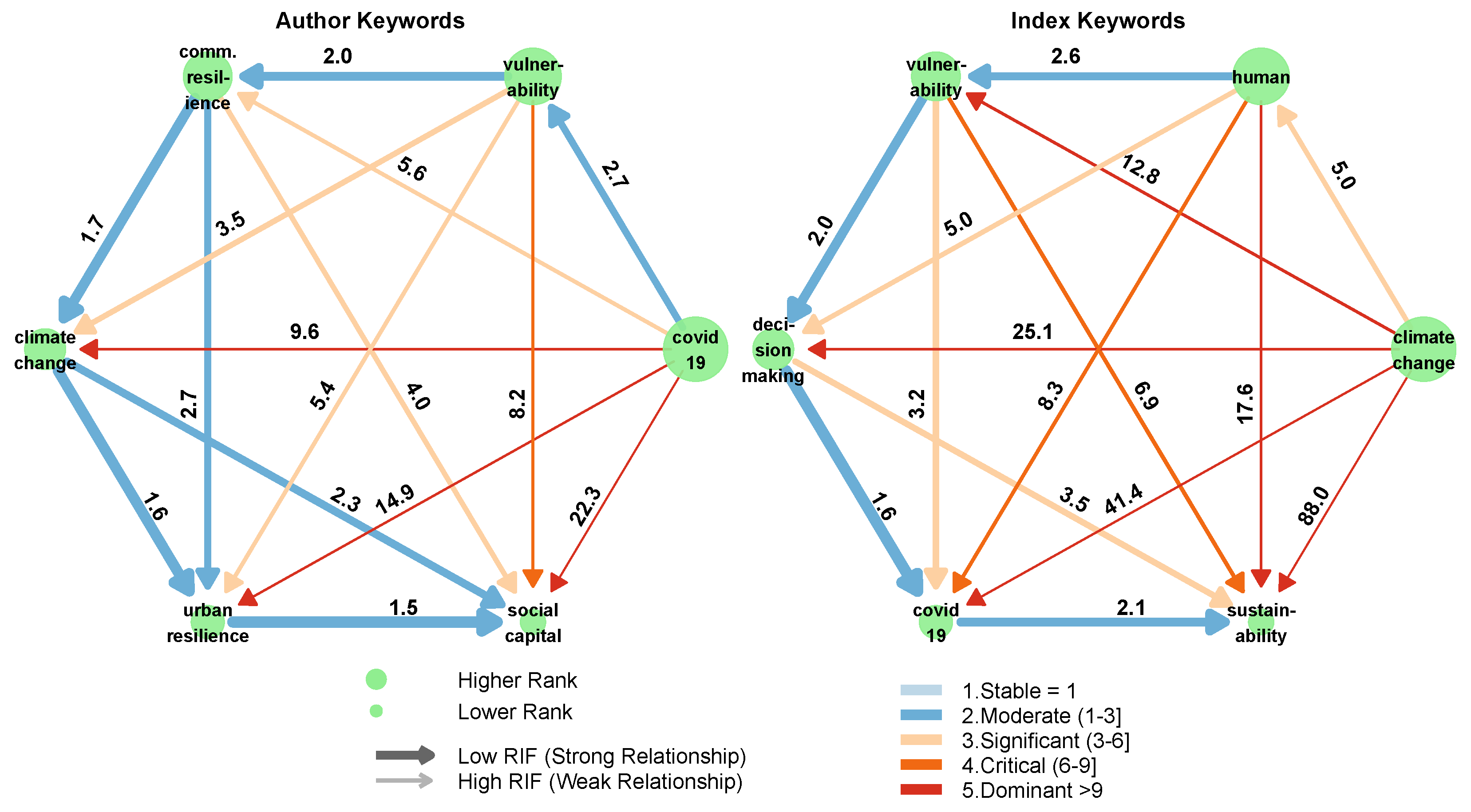 In the author keyword network, COVID-19 stands out as the top-ranked and most dominant concept. It receives multiple incoming connections, most of which are thin, such as from urban resilience () and social capital (), highlighting steep declines in relative importance as measured by RIF. Concepts like vulnerability () and community resilience () exhibit thicker links, indicating narrower dominance gaps, though still asymmetrical. Despite these differences, COVID-19 also functions as a conceptual hub, likely to co-occur with many other terms due to its frequency and central role. A similar structure emerges in the index keyword network, where climate change is the most prominent node. It receives directional links from decision making (), COVID-19 (), and vulnerability (), most of which are relatively thin. In contrast, the connection from human () is thicker, indicating a smaller dominance gap. Like COVID-19, climate change may frequently co-occur with other concepts despite being structurally distant in the RIF hierarchy.