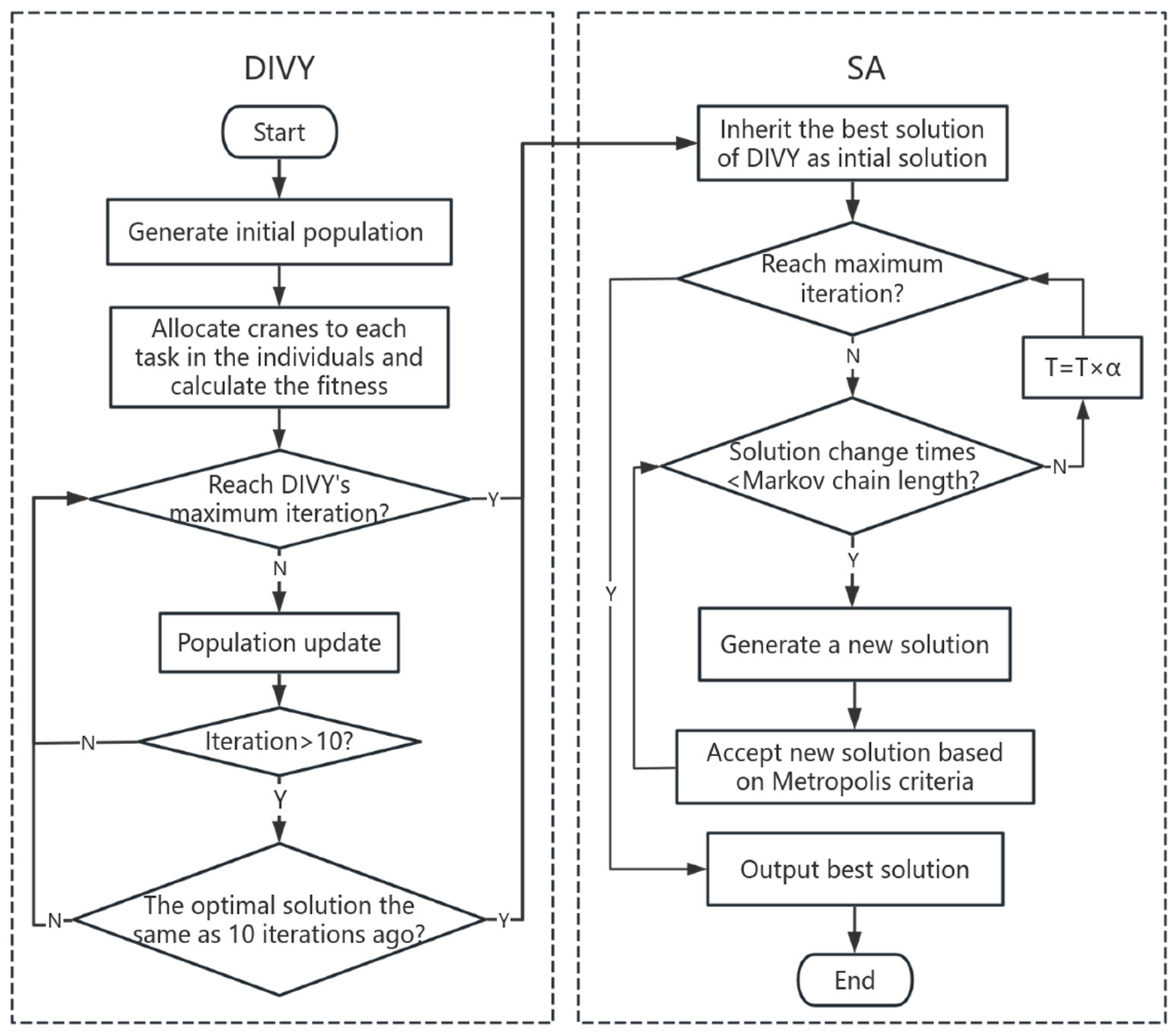 The SA algorithm exhibits a strong ability for fine-grained search when tackling highly complex optimization problems, owing to its temperature decay mechanism. However, its performance is relatively sensitive to parameter configurations: reasonable parameter configurations enable it to ensure optimization accuracy while balancing computational efficiency, whereas inappropriate parameter configurations may lead to slow convergence or degradation in solution quality. By using the high-quality solution from DIVY as the starting point, we overcome SA’s initialization sensitivity.