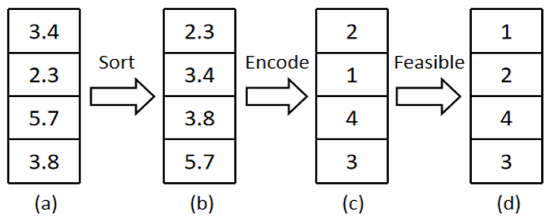 Figure 4. First, a continuous encoded sequence (a) consisting of random numbers is generated. Then, these numbers are sorted in ascending order based on their magnitude, and an integer encoding (c) is derived by mapping each value to its rank in the ascending order. Finally, to improve the initial population’s quality, we perform feasibility processing: tasks with time-window constraints are extracted, sorted by their start times, and reinserted into the original positions vacated by the extraction. This feasibility processing helps improve the quality of the initial task sequence population.