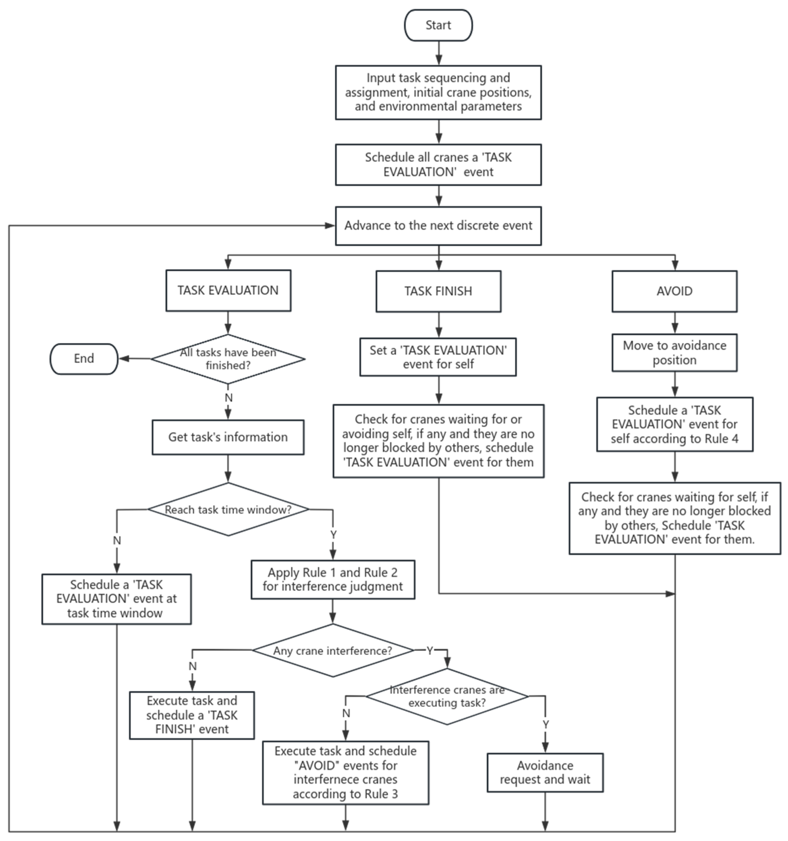 In the worst case, each task corresponds to discrete events, and the interference judgment for each event requires traversing r cranes. Therefore, the time complexity of the simulation module for a complete scheduling scheme is: .