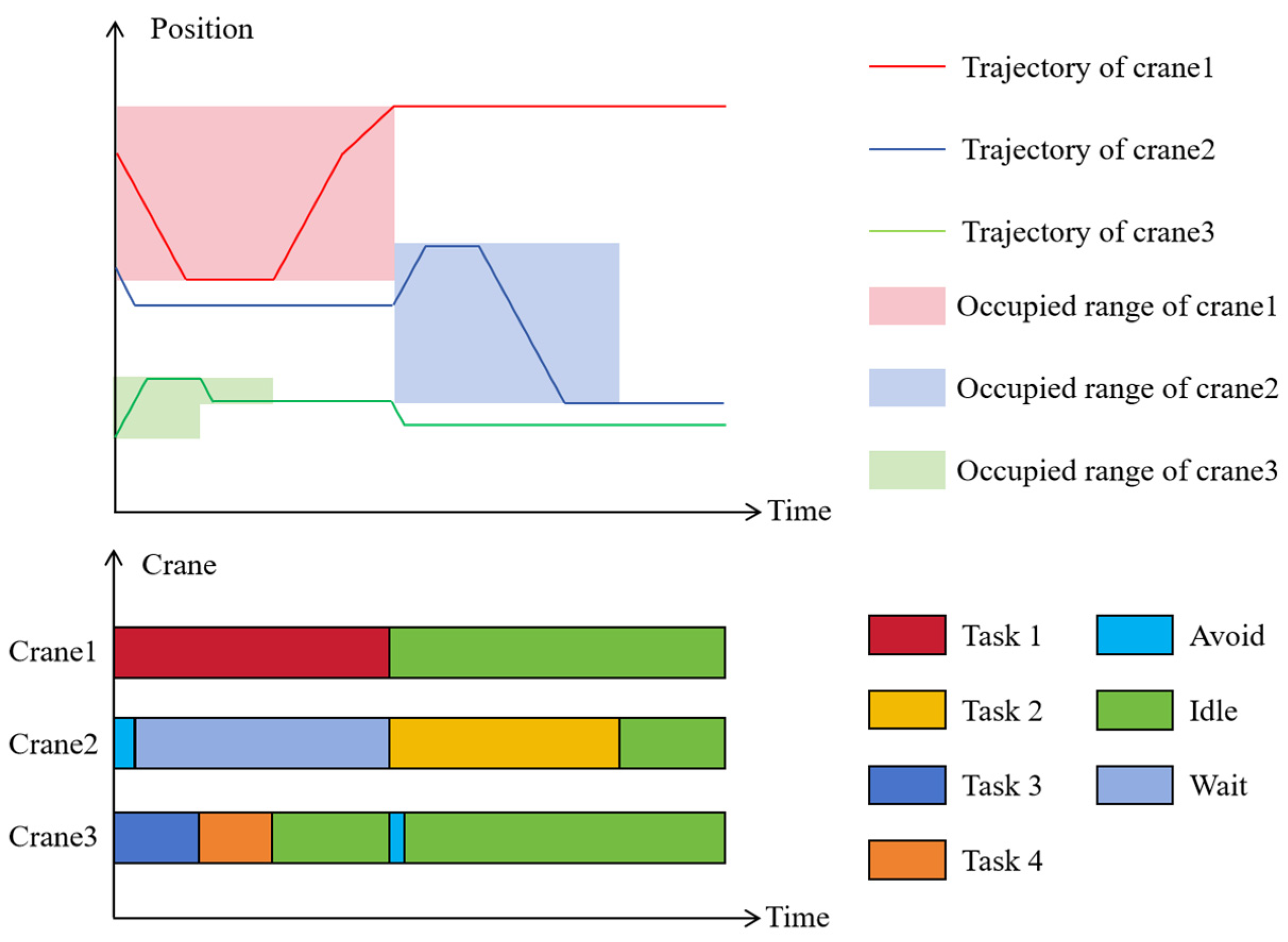 In the waste crane scheduling problem, task interactions do not originate from logical precedence or procedural dependencies, as the three types of tasks are operationally independent. Instead, the interaction is characterized by an indirect coupling caused by the shared rail system and limited operational space. As illustrated in