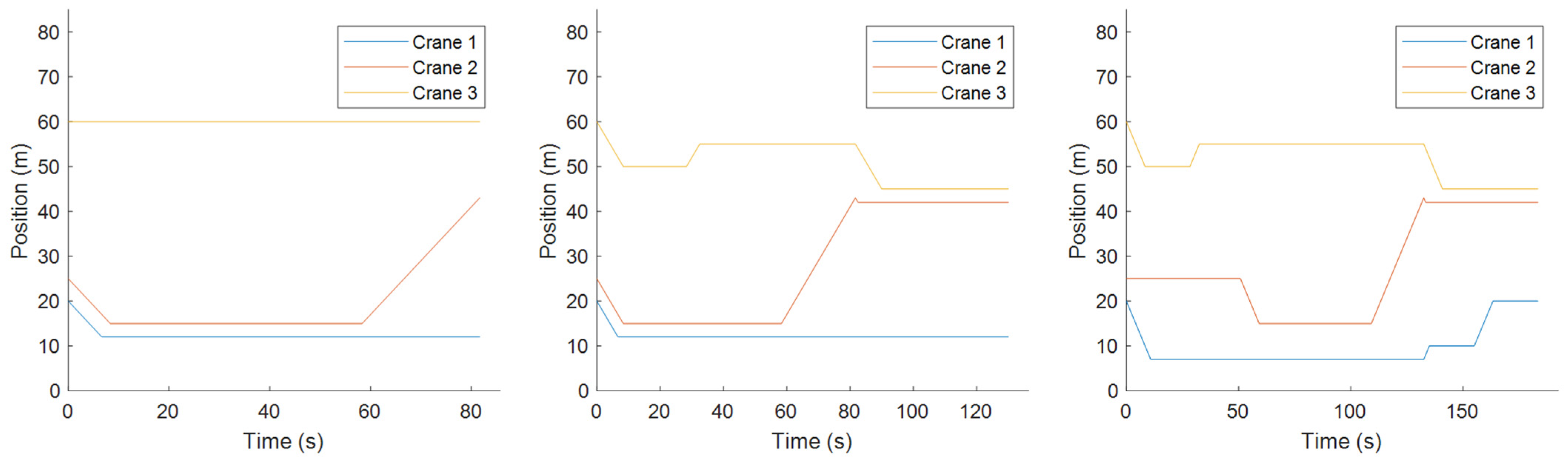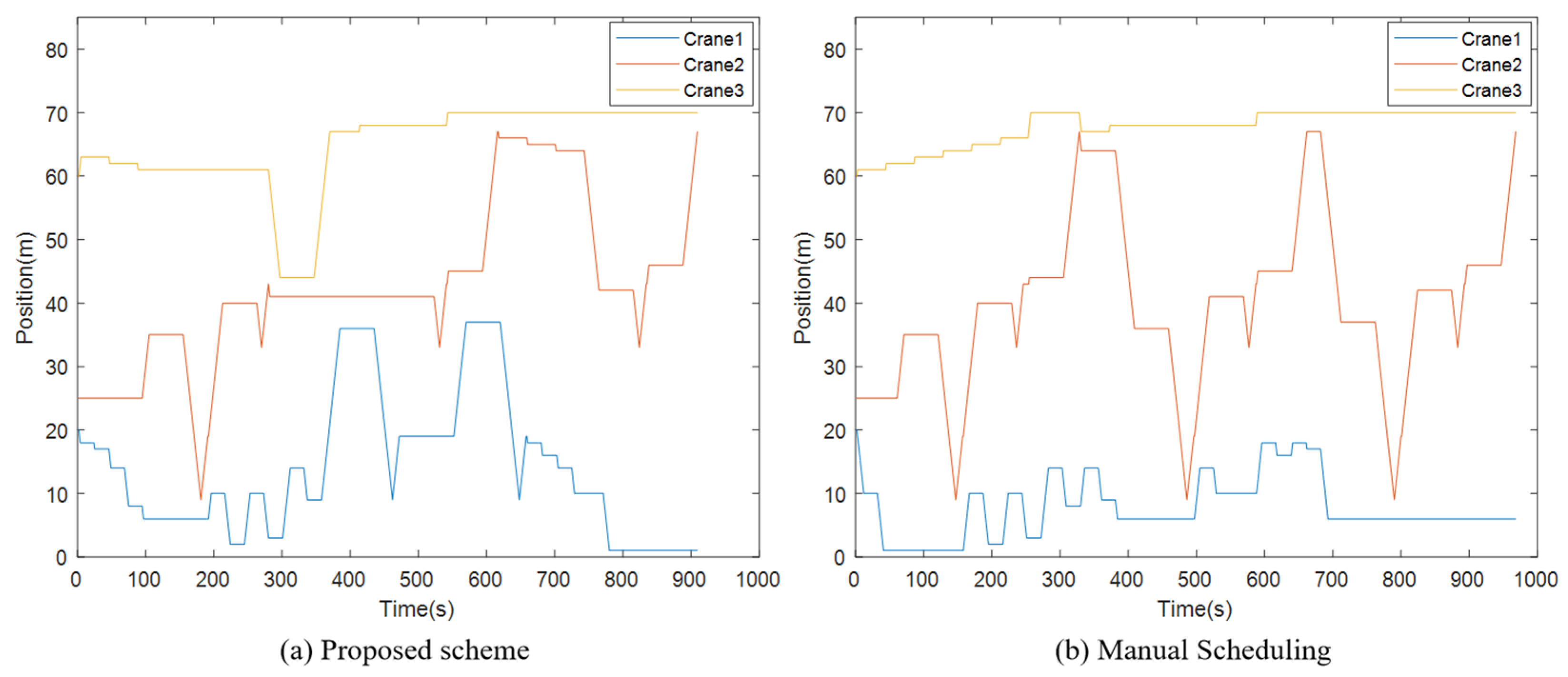 It shows that the proposed scheme outperforms the manual scheduling method in all five cases, achieving an average reduction of 22.19% in the total traveling distance of cranes. Taking Case 3 as a representative example, the trajectories of the cranes’ gantries under the two scheduling methods are shown in