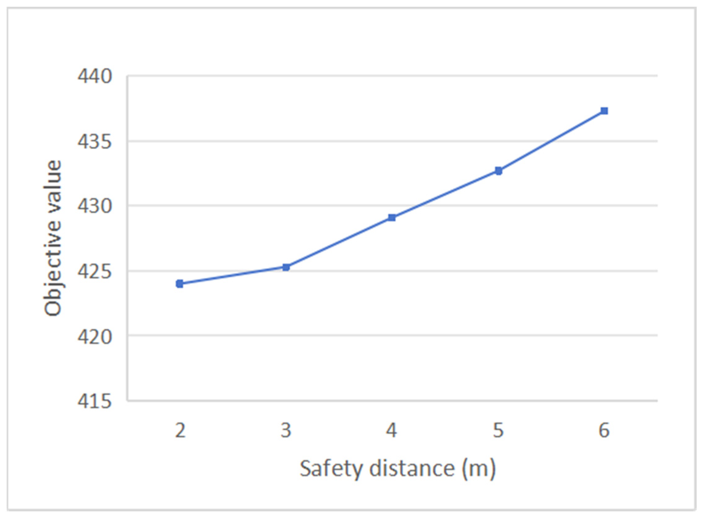 dsafe that directly affects the simulation operation. We test an instance with 25 tasks, varying the safety distance from 2 m to 6 m. Each data point represents the mean of 20 independent runs, as shown in