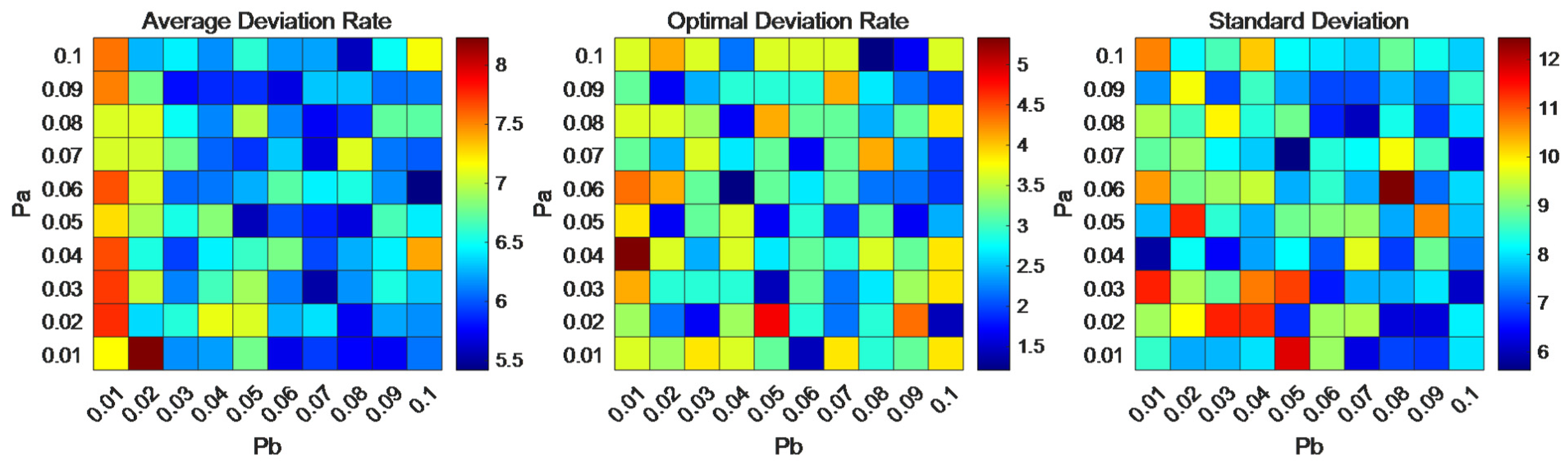 The main parameters to be determined for the DIVY-SA algorithm include: Pa and Pb (for the DIVY component), initial temperature, terminal temperature, Markov chain length, and cooling rate (for the SA component). For the DIVY component, we employ a comprehensive testing approach. Using a case with 25 tasks, the population size of the DIVY algorithm is set to 30, and the maximum number of iterations is set to 100. We evaluate parameter combinations based on the Average Deviation Rate (ADR), Optimal Deviation Rate (ODR), and Standard Deviation (SD) over 20 independent runs. For the calculation of the deviation rate, the optimal solution is represented by the LB obtained by solving the relaxed problem with Gurobi.