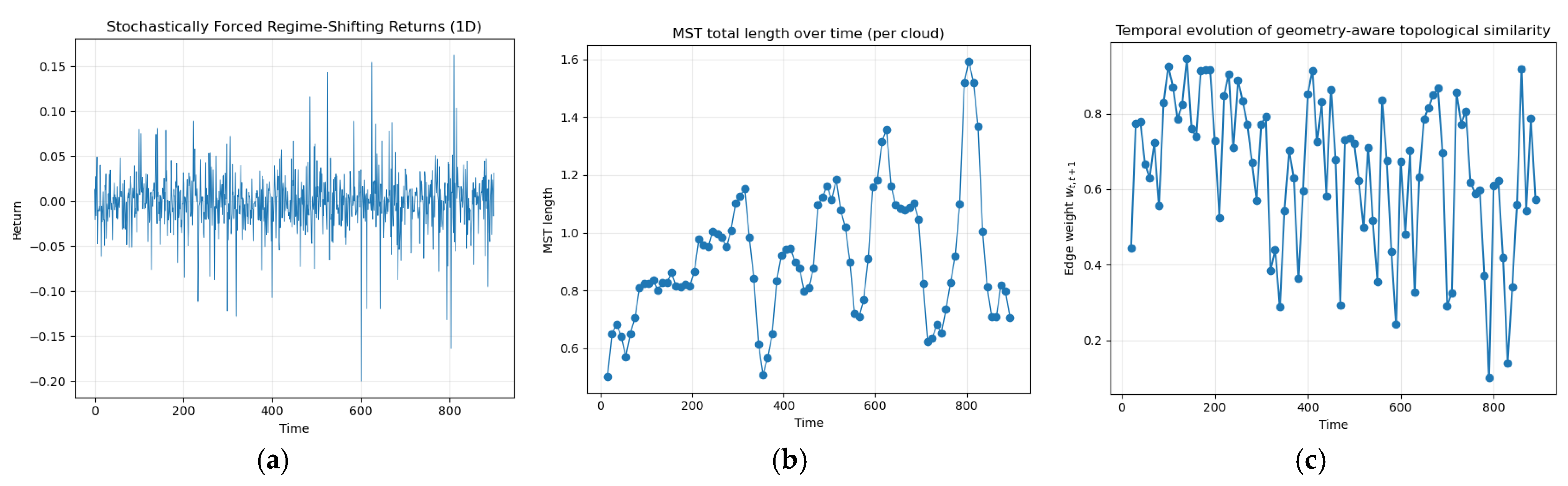 - Mesoscopic scale: Intermediate- and long-range dependence governing regime persistence appears as a sustained elevation in , persistent bursts in , and densely connected sub-graphs in linking windows with similar reconstructed geometry.