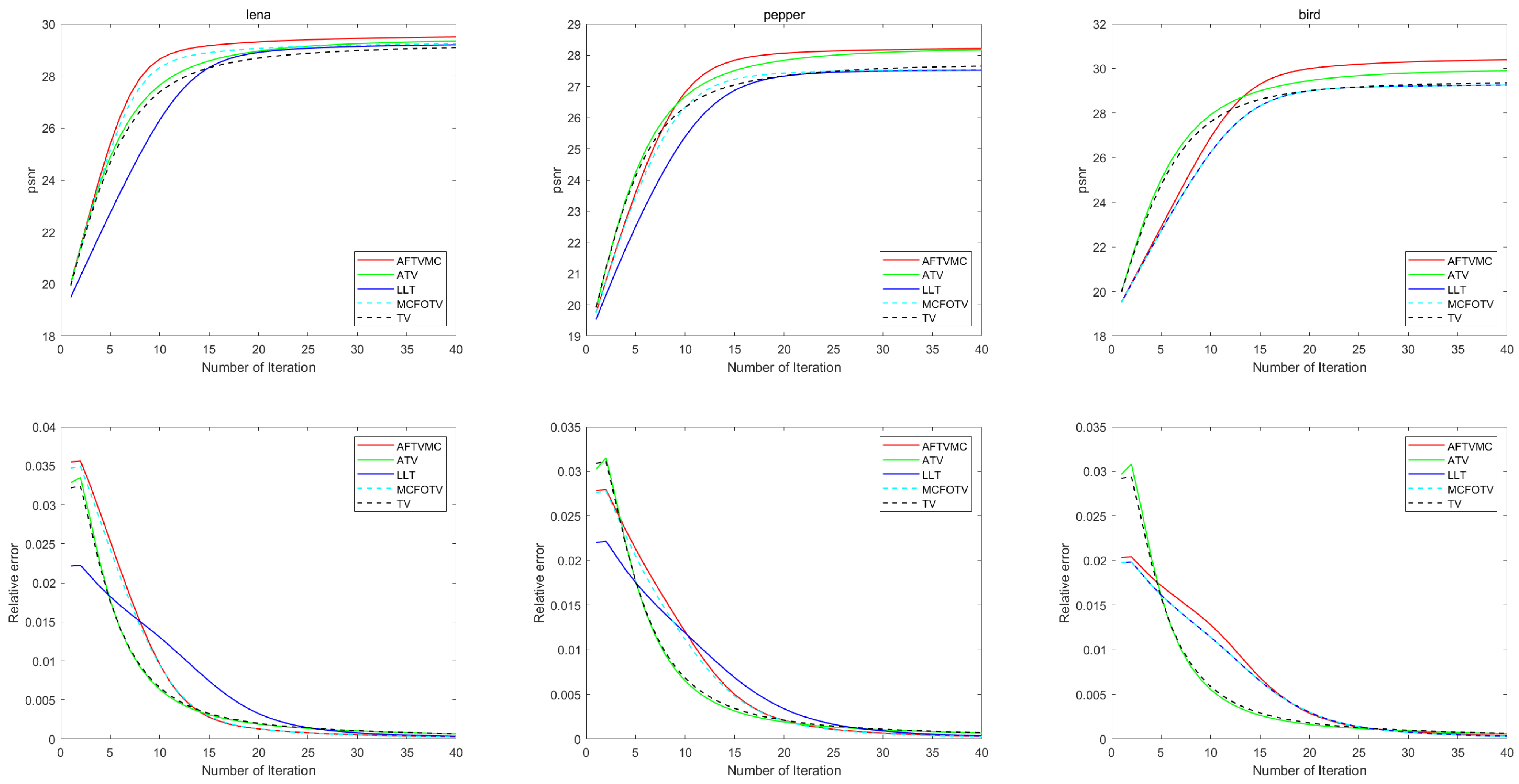 4.4.2. Convergence Rate Comparison (PSNR vs. Iterations; Relative Error vs. Iterations)