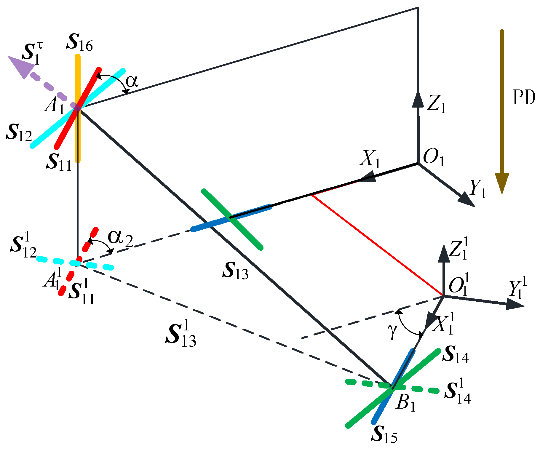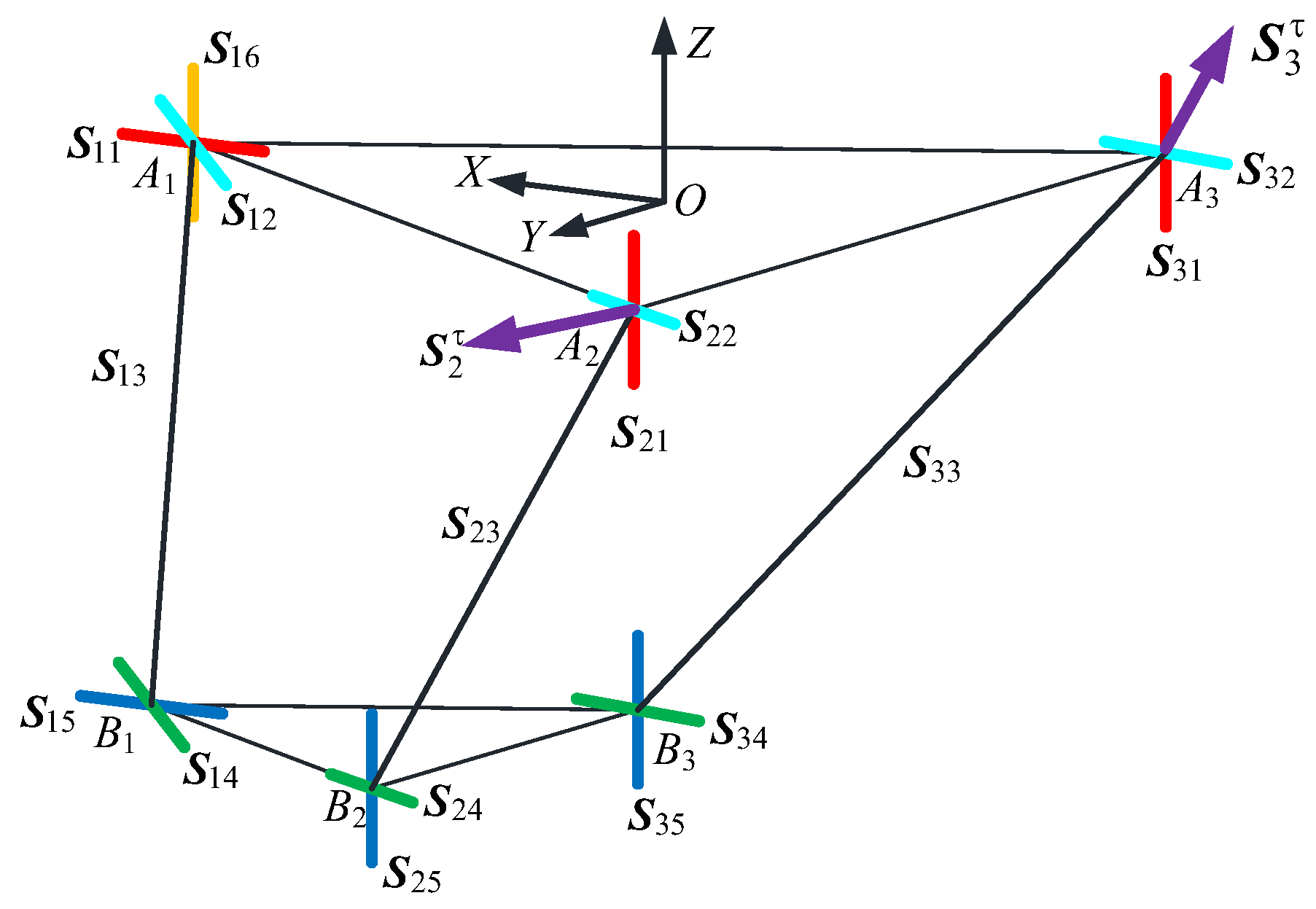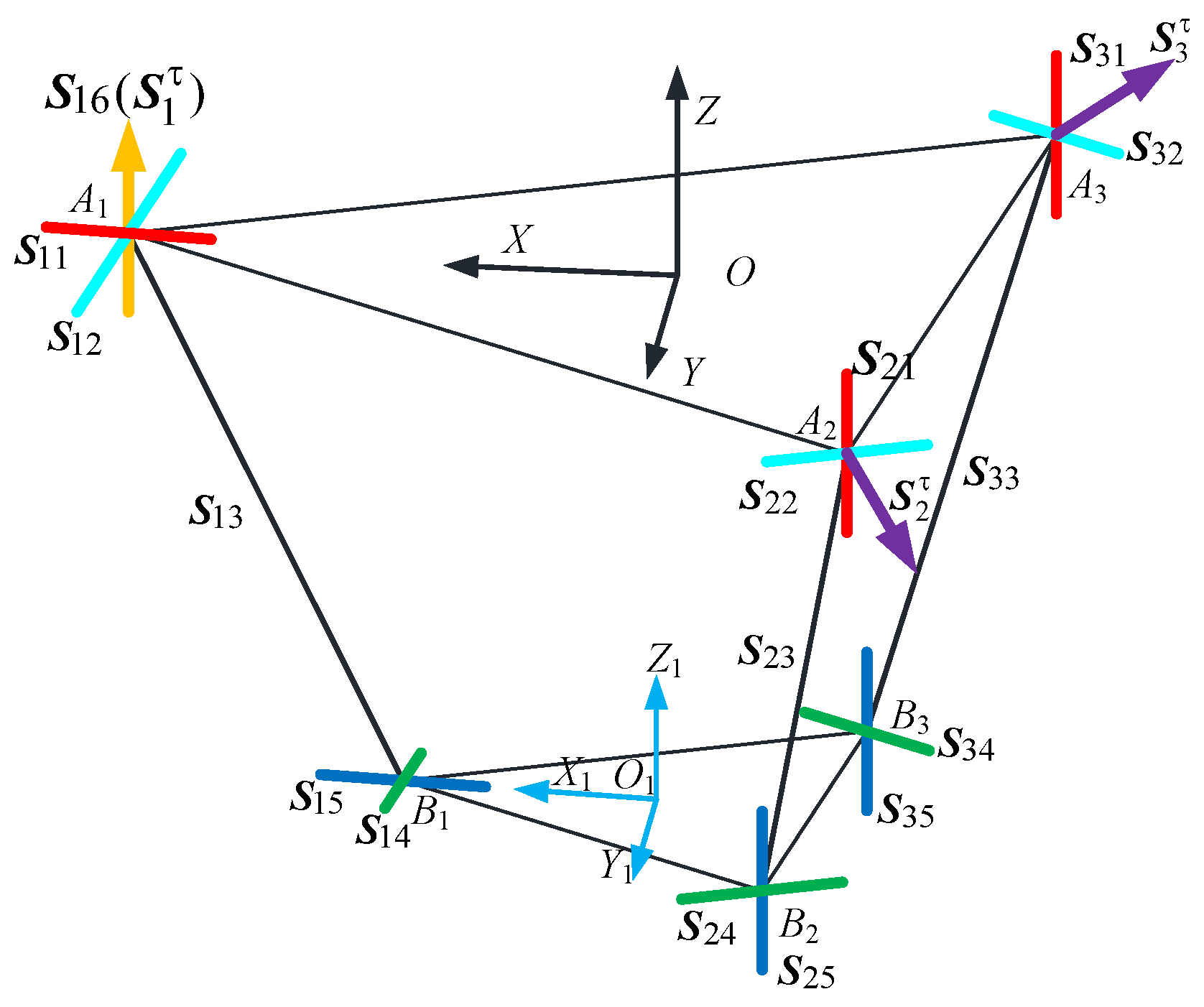 is a 2 × 6 matrix, which is the constraint Jacobian matrix of the mechanism. Each row represents a constraint couple imposed by a limb on the moving platform. The rank of should be 2. When the rank of is less than 2, the constraint spiral system of the moving platform is linearly related, the constraints on the moving platform are reduced accordingly, the degree of freedom of the moving platform increases, and the mechanism enters the constraint singular state.