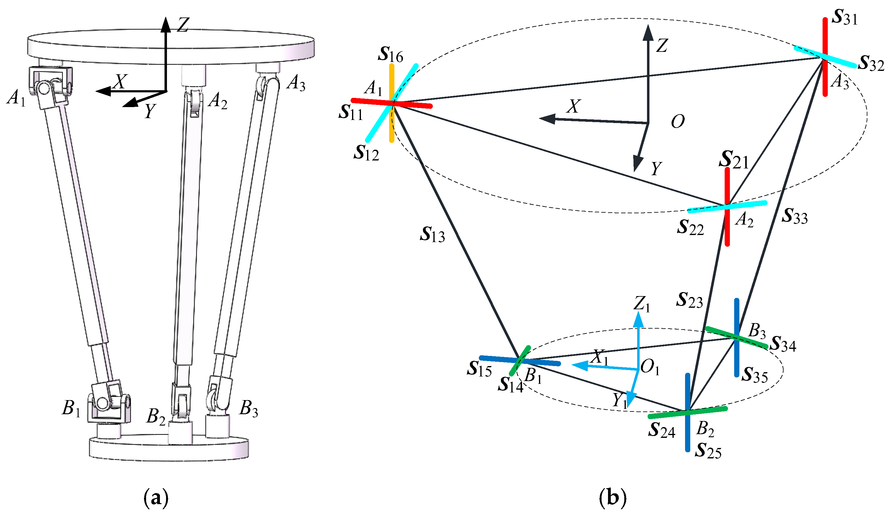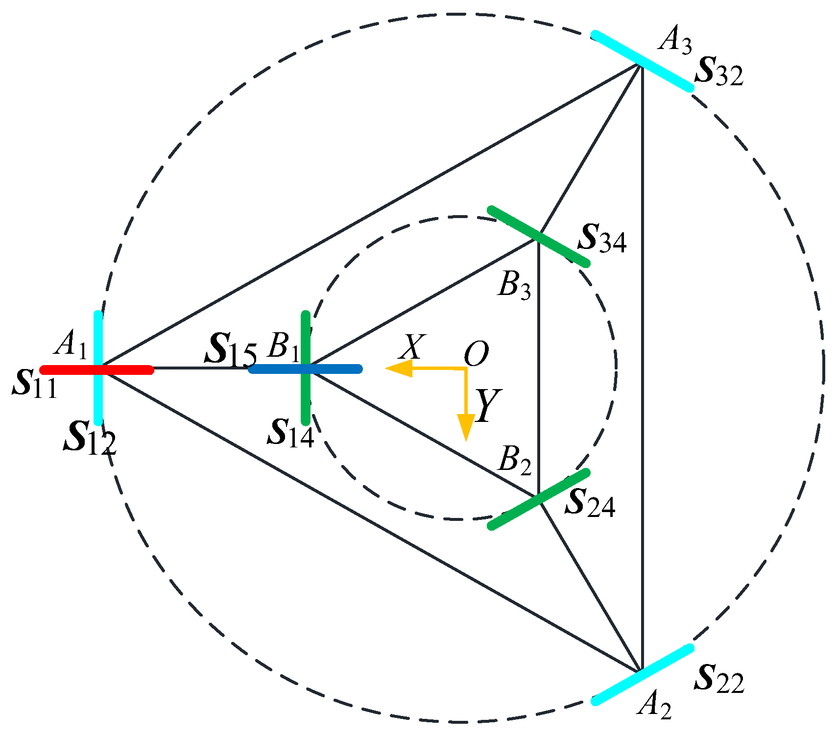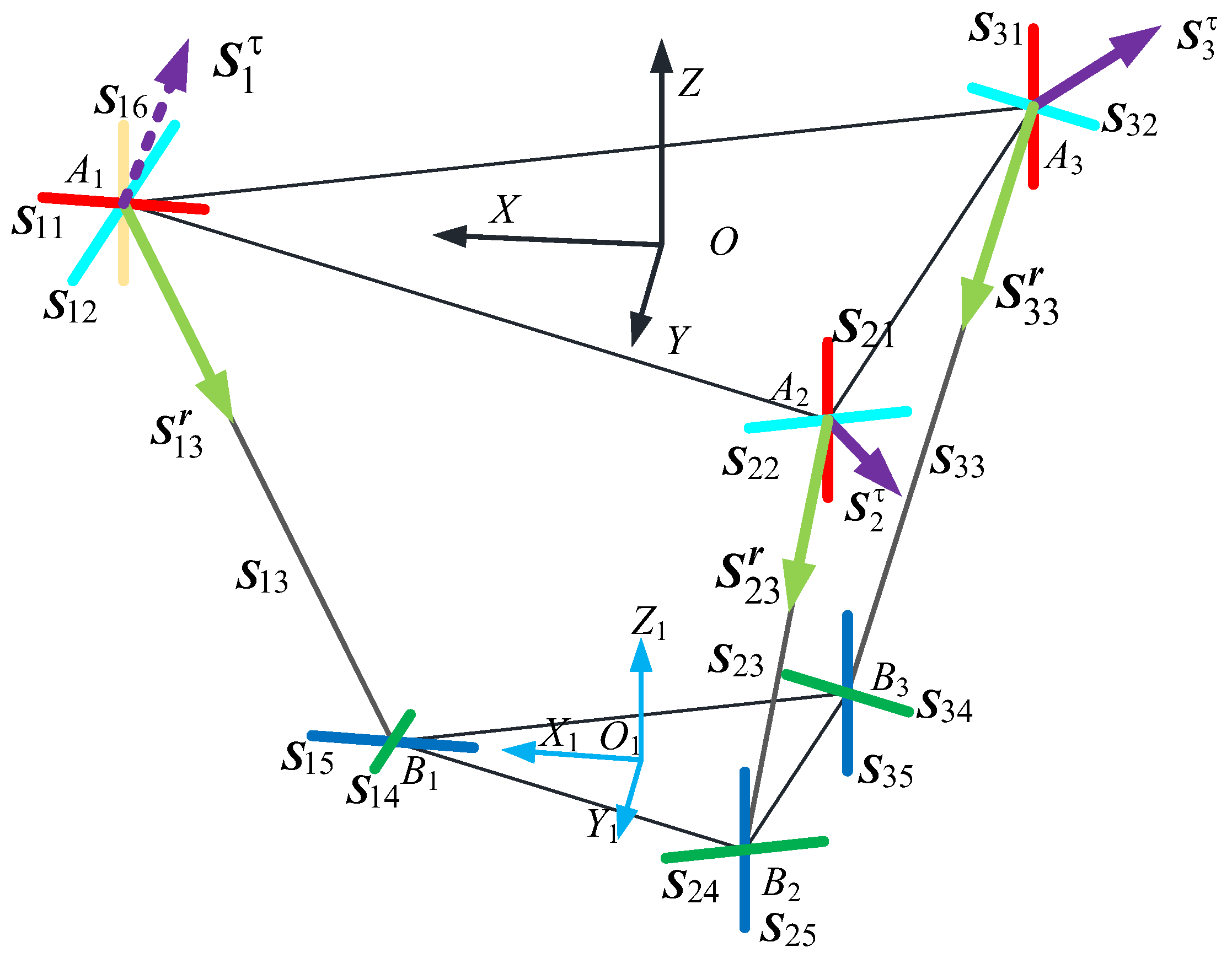 is a 2 × 6 matrix, which is the constraint Jacobian matrix of the mechanism. Each row represents a constraint couple imposed by a limb on the moving platform. The rank of should be 2. When the rank of is less than 2, the constraint spiral system of the moving platform is linearly related, the constraints on the moving platform are reduced accordingly, the degree of freedom of the moving platform increases, and the mechanism enters the constraint singular state.
