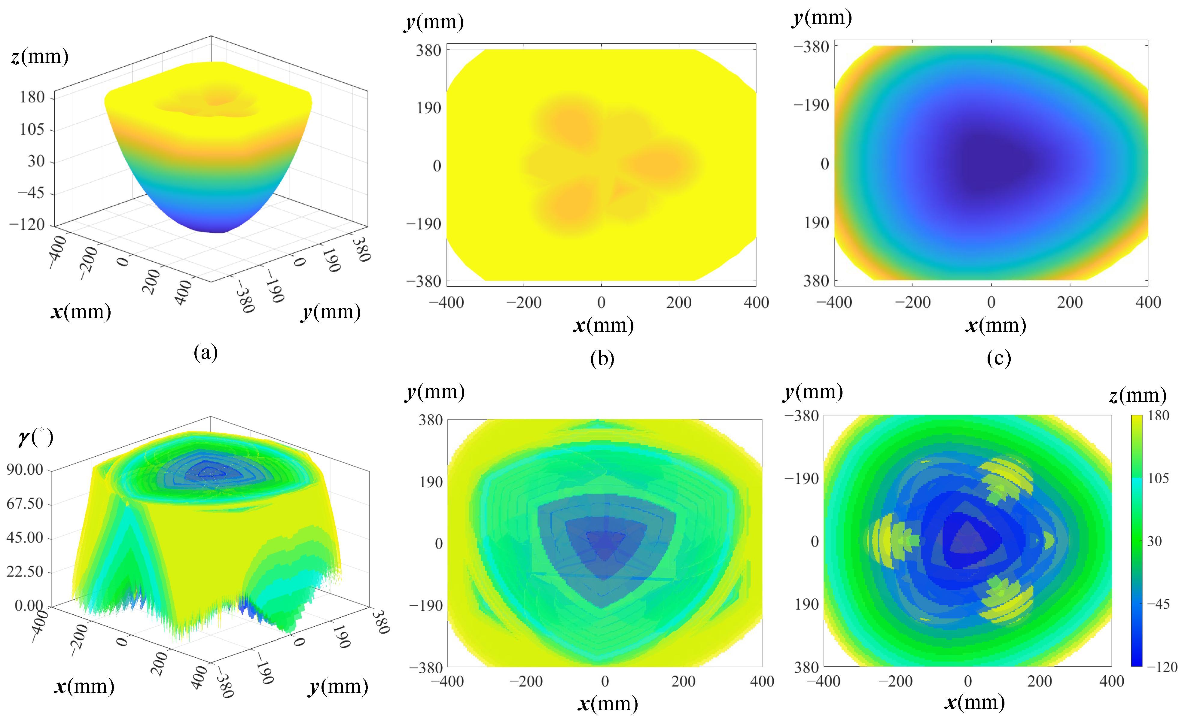 The absolute value of the maximum rotation angle of the mechanism at this working point is taken and converted into an angular value, which serves as the third coordinate axis. The -displacement is taken as the fourth axis to obtain the workspace surfaces corresponding to different z-displacements. The rotation angle of the middle part of the working space plane of each -displacement plane can be all up to , and the rotation angle of the same plane decreases gradually from the inside to the outside.