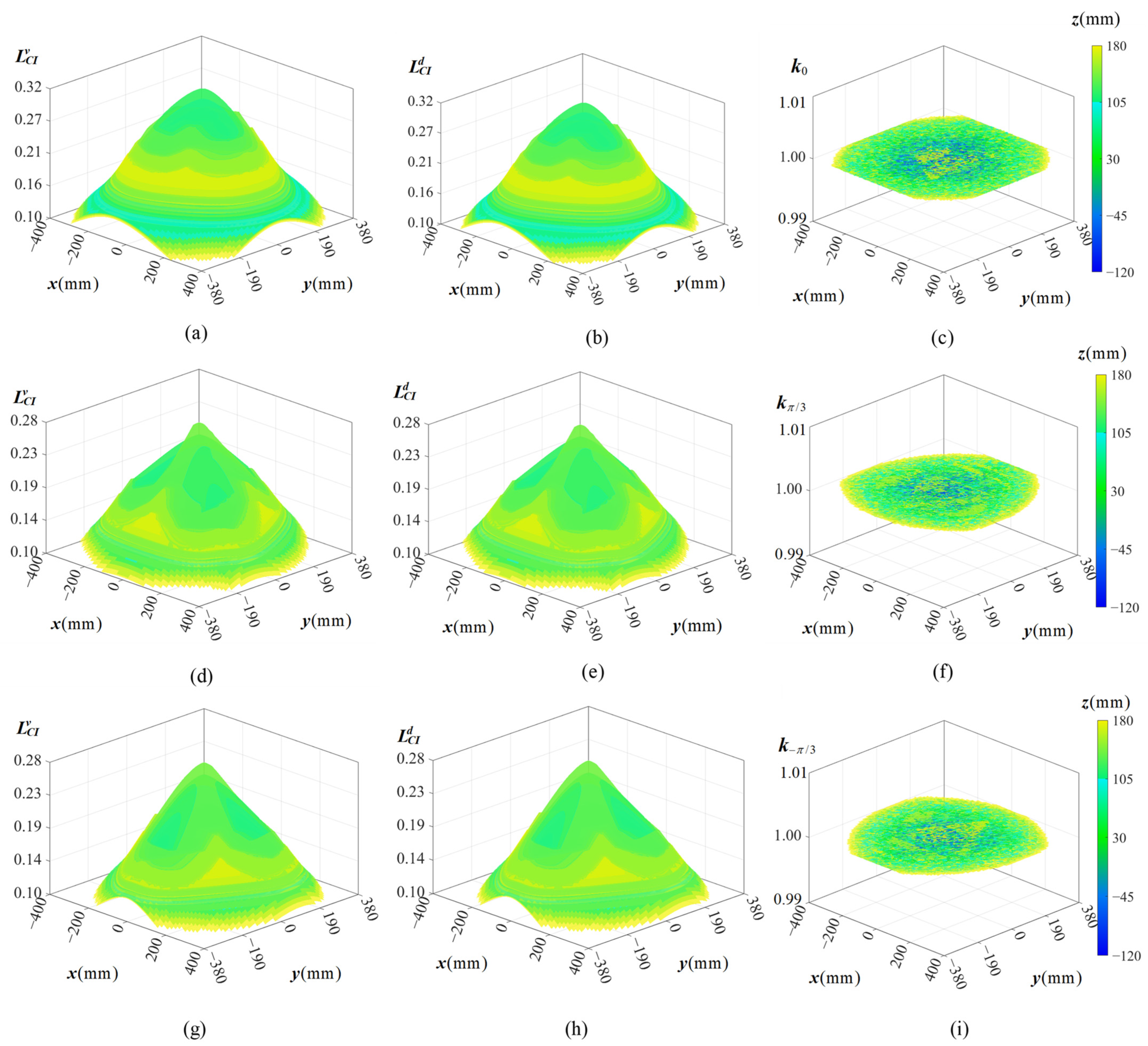 Figure 14b,e,h that the distribution of dexterity calculated by the two methods in the workspace is the same.
