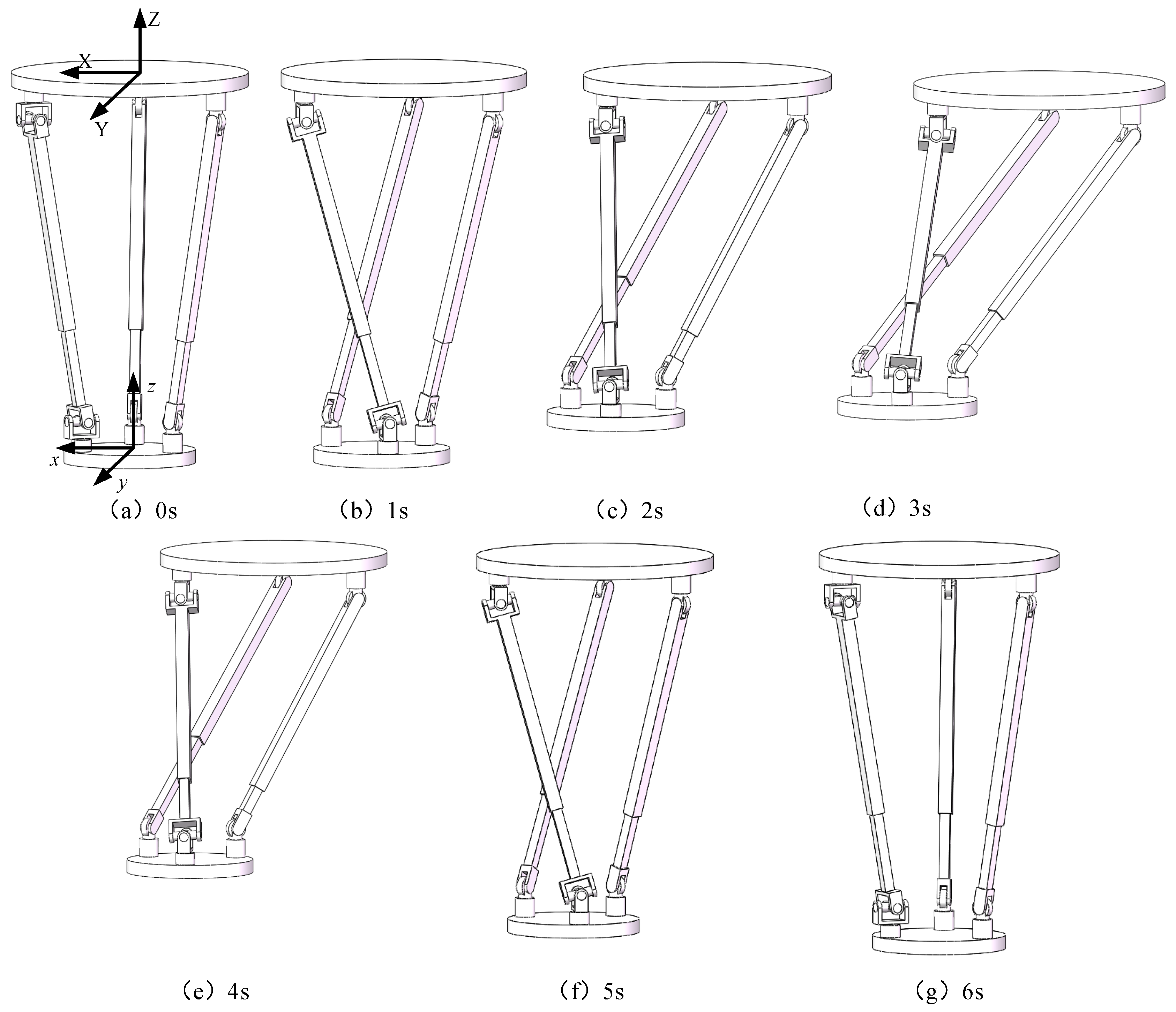 Figure 15, a diagram of the three-dimensional simulation process of the reconfigurable parallel mechanism is presented. It can be observed that the motion of the mechanism follows a symmetrical pattern: the postures at 0 s and 6 s, 1 s and 5 s, and 2 s and 4 s correspond to each other, respectively. The mechanism is in its initial state at 0 s. The period from 0 to 3 s represents the forward stroke, while the period from 3 to 6 s represents the return stroke.