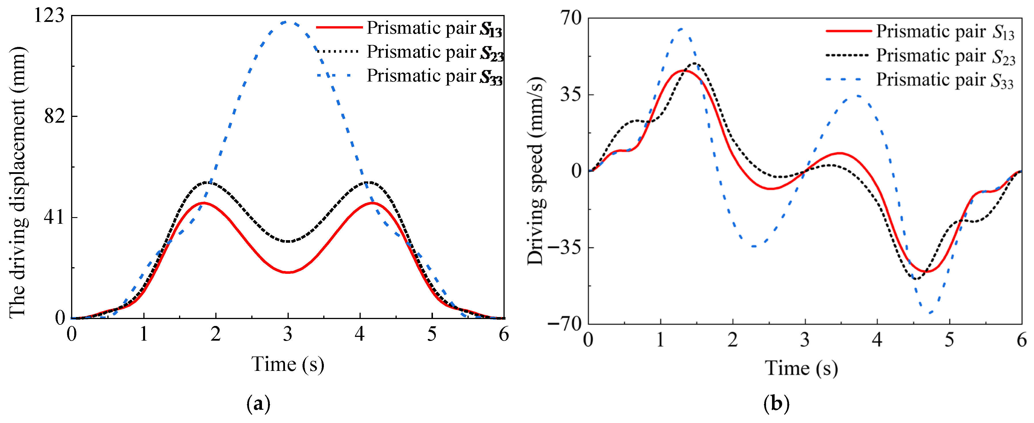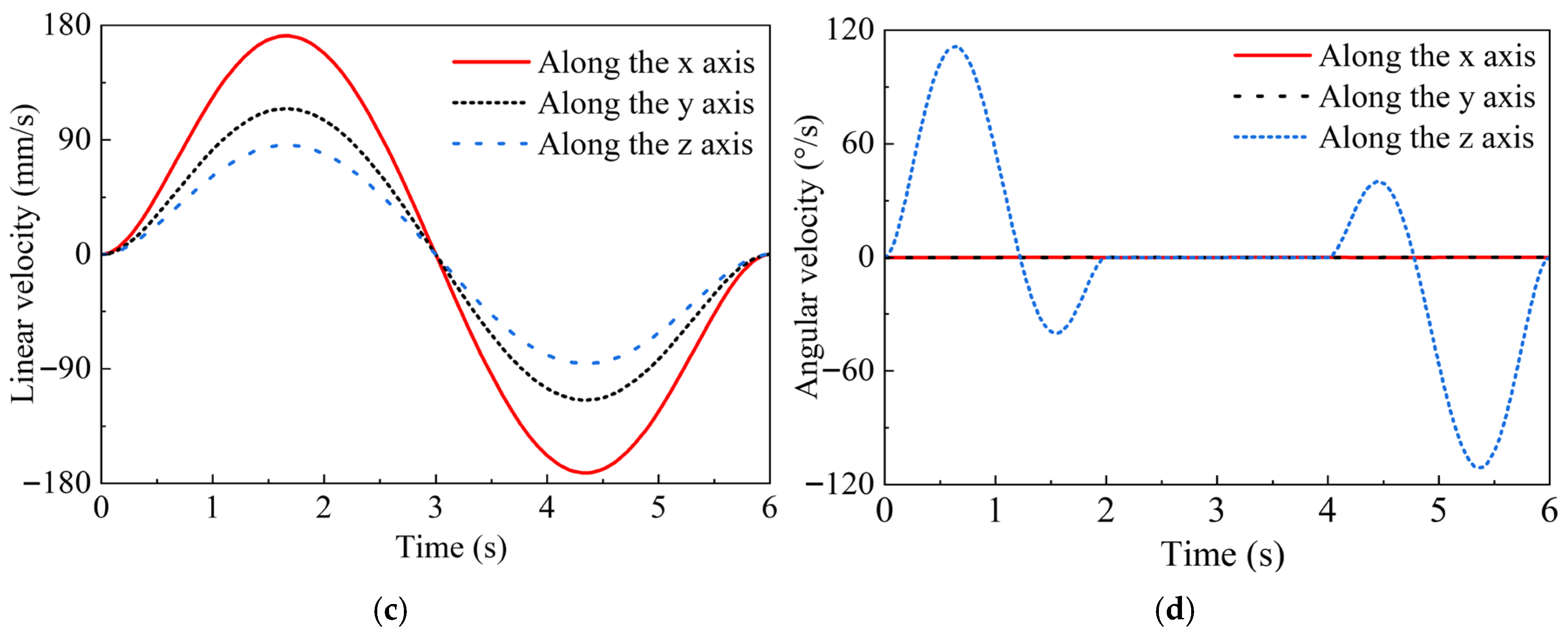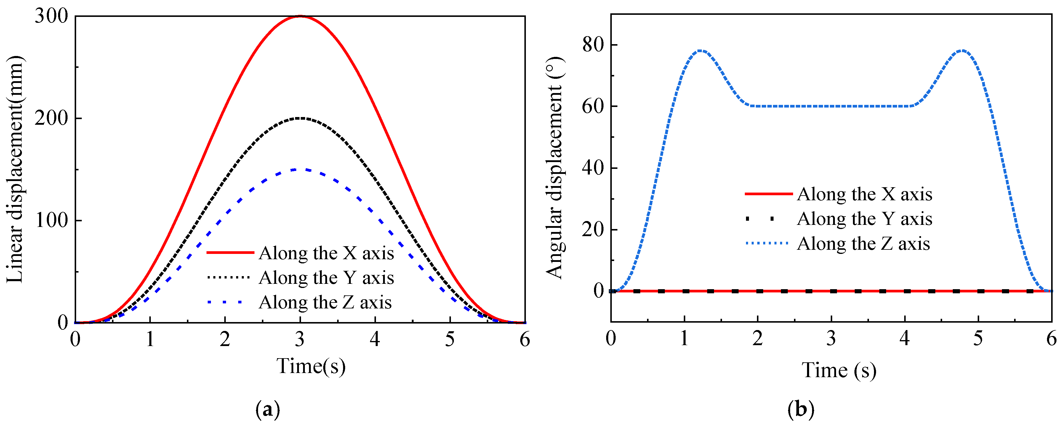 Figure 16a,b, after simulation, the displacement of the center point of the moving platform along each direction and the rotational displacement are measured. It can be seen from the figure that the moving platform translates 300 mm along the
