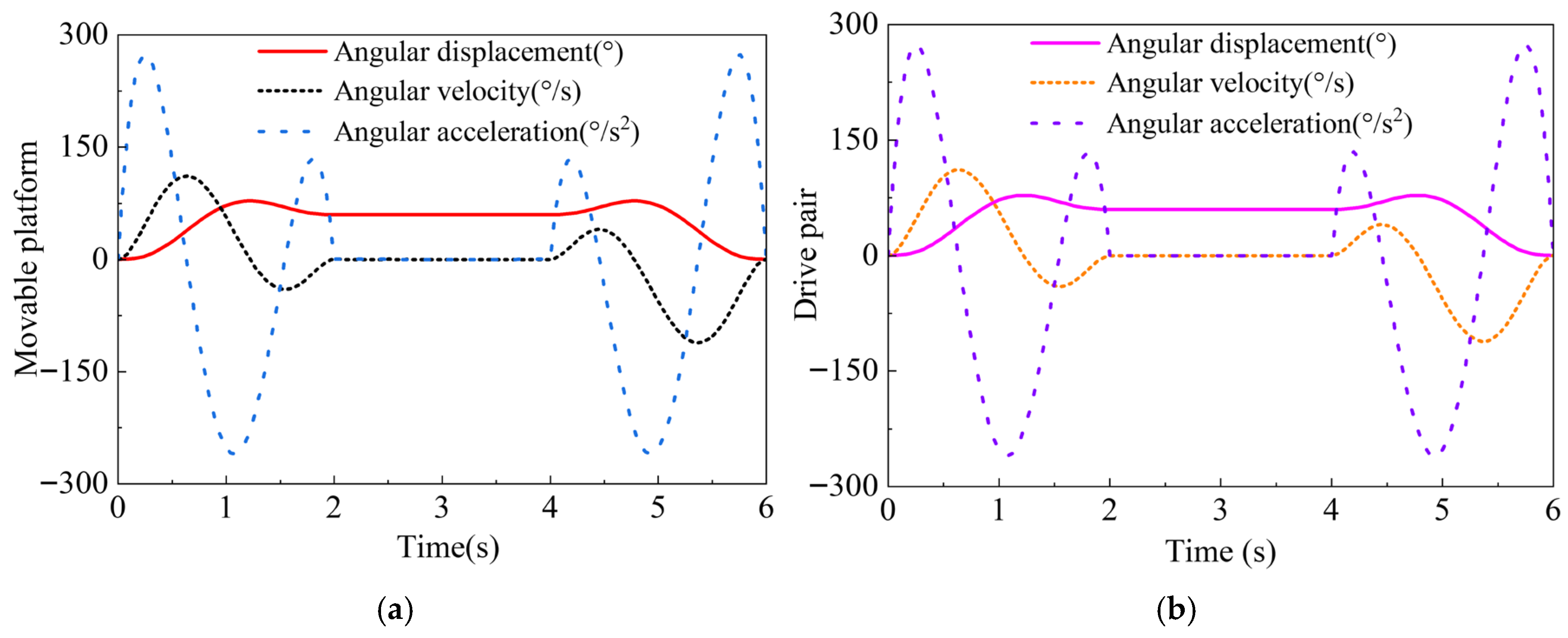The rotational angular velocity of the moving platform is equal to the angular velocity of the revolute joint , the corresponding angular displacement obtained by integration is also identical, and the angular acceleration corresponding to the derivation is also the same. It can be obtained that the rotation law of the moving platform is consistent with that of the actuated joint .