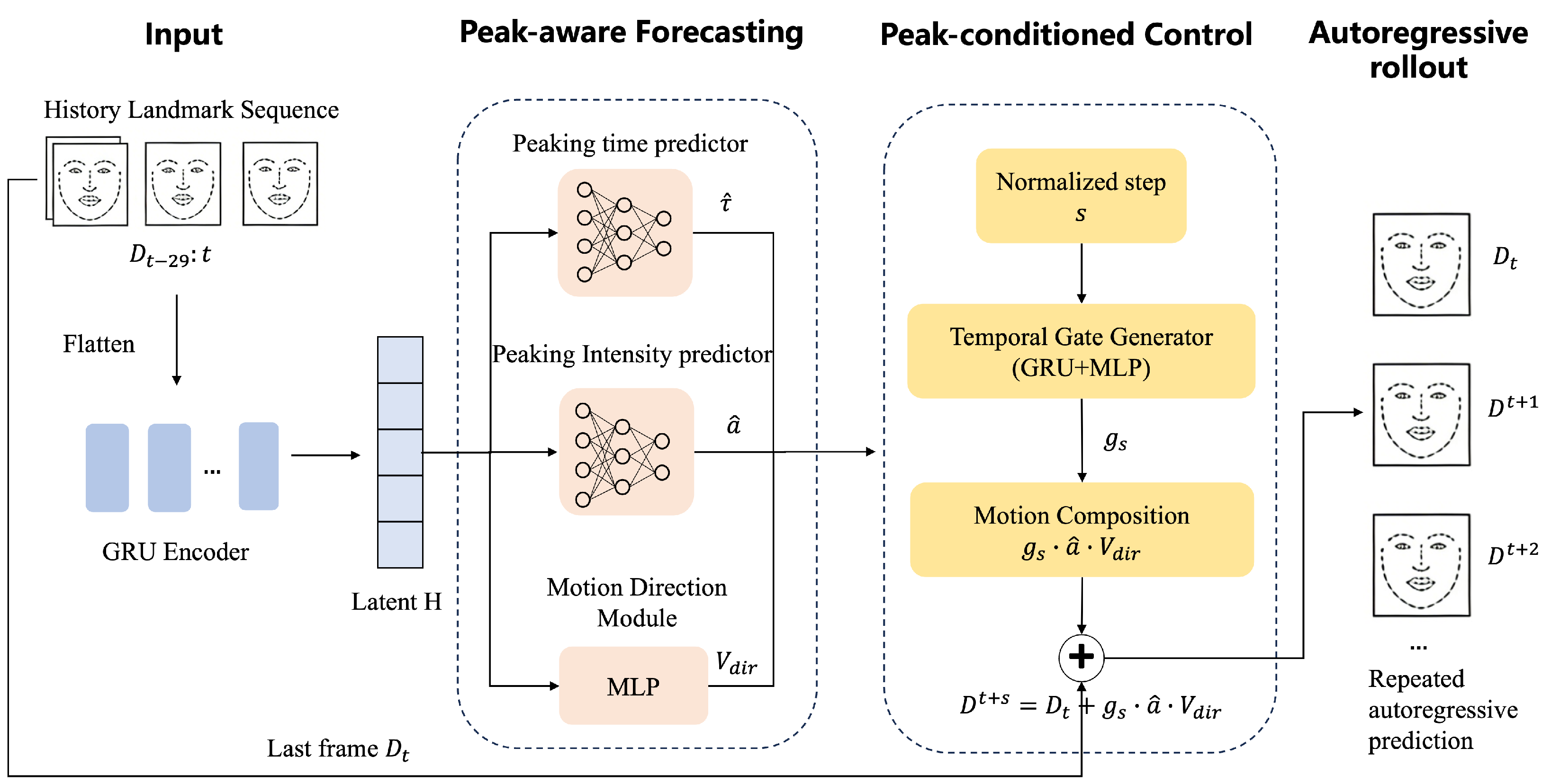 Figure 1, the proposed framework consists of three main components: a shared temporal encoder, a peak-aware forecasting module, and a peak-conditioned control module. The encoder first extracts a latent representation from a short history of facial landmark sequences. Based on this representation, the peak-aware forecasting module predicts key motion attributes of the upcoming expression dynamics, including the peak timing, peak intensity, and a global motion direction. These peak-aware parameters guide the peak-conditioned control module, which generates short-horizon landmark trajectories through temporal gating and motion composition. Long-term facial motion is then obtained by autoregressively rolling the control module forward.