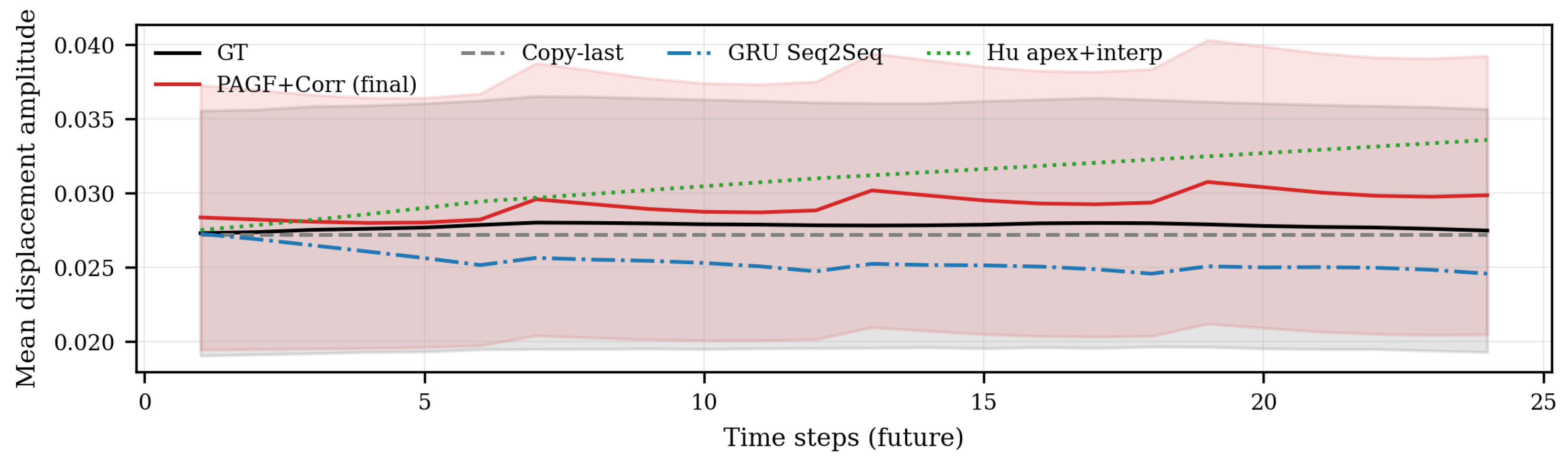 Among data-driven approaches, GRU Seq2Seq and Hu-style Apex+Interp achieve reasonable distortion levels but still incur higher errors than the static baseline. This indicates that generic recurrent models struggle to balance motion generation with trajectory stability. Our proposed PAGF-base effectively suppresses the artifacts of unconstrained generation, achieving a low distortion () comparable to Copy-Last-Frame. Building on this, the final PAGF+Corr variant maintains a competitive distortion profile (global MSE: ; jaw MSE: ), only marginally higher than the static baseline. Crucially, as will be discussed in the subsequent dynamics analysis, this slight increase in MSE is a necessary trade-off to restore the dynamic vitality and temporal alignment that static baselines completely lack.