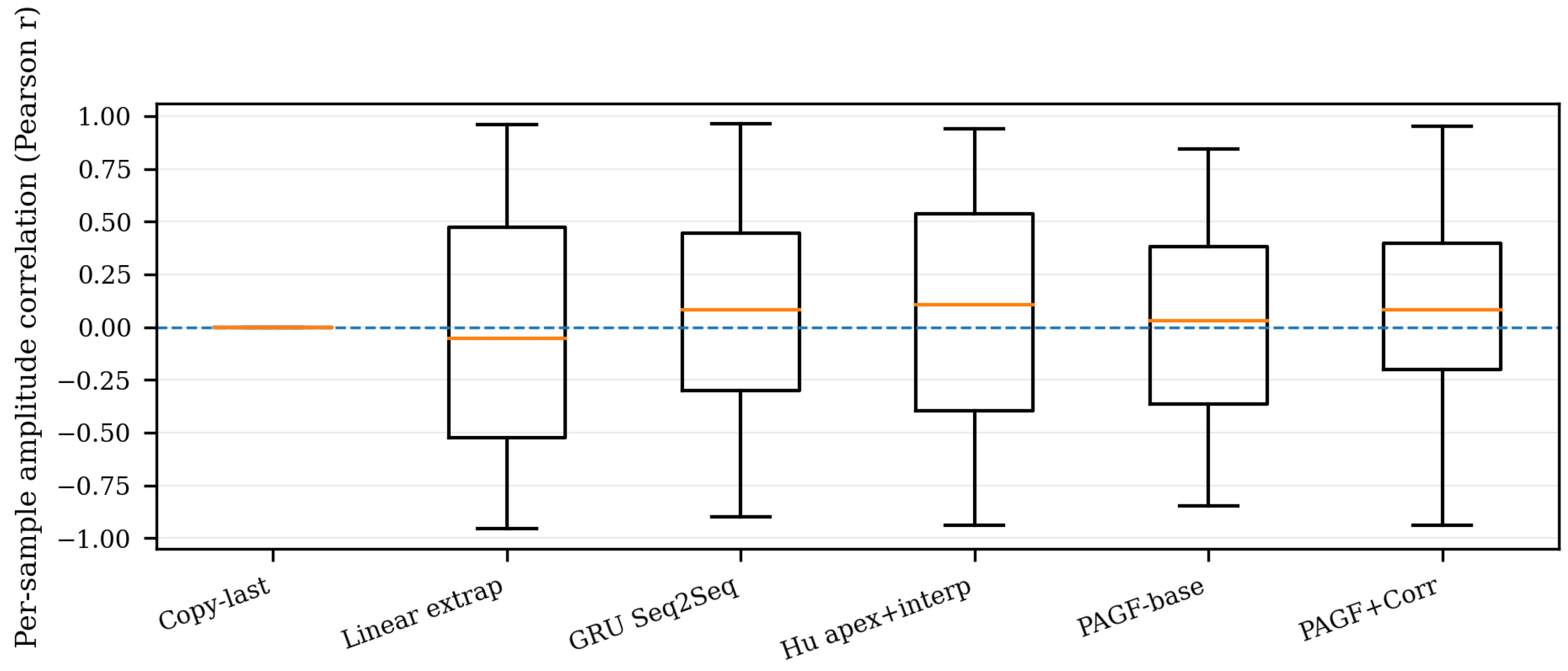 Figure 3) reveals that, while Seq2Seq (blue) suffers from amplitude decay over time, PAGF+Corr (red) robustly maintains the expression intensity, closely tracking the ground-truth band. The amplitude correlation distribution (